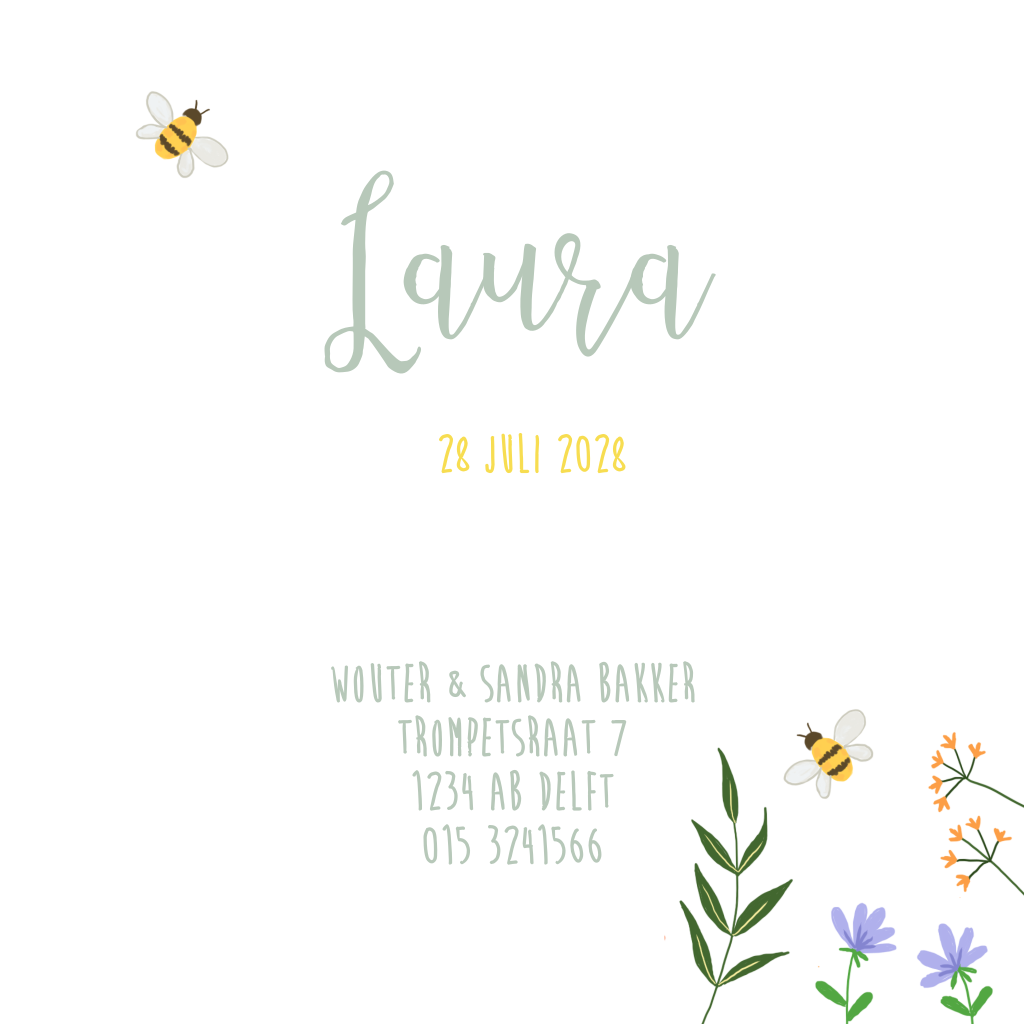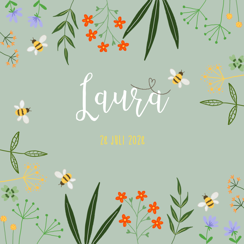 Een vrolijke geboortekaartje voor een meisje met bloemen op groen. Met leuke details als bijen en klavertjes 4. (9996)