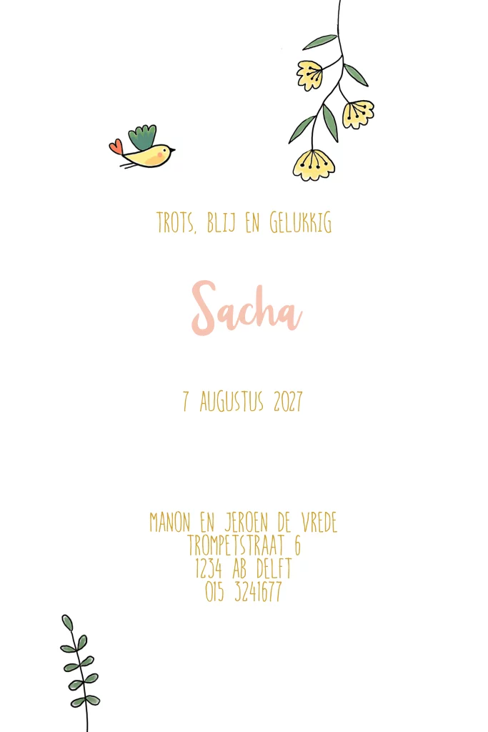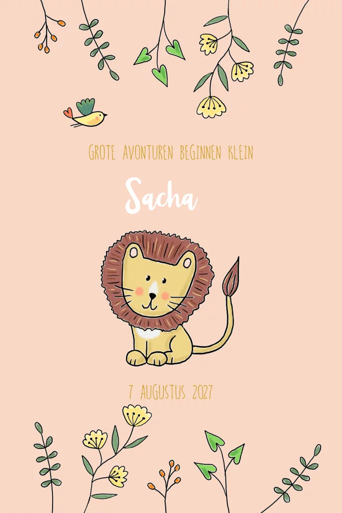 Een lief geboortekaartje voor een meisje met een leeuwtje, vogel en planten en bloemen op een roze achtergrond. Dit geboortekaartje is helemaal naar wens aan te passen. (7720)