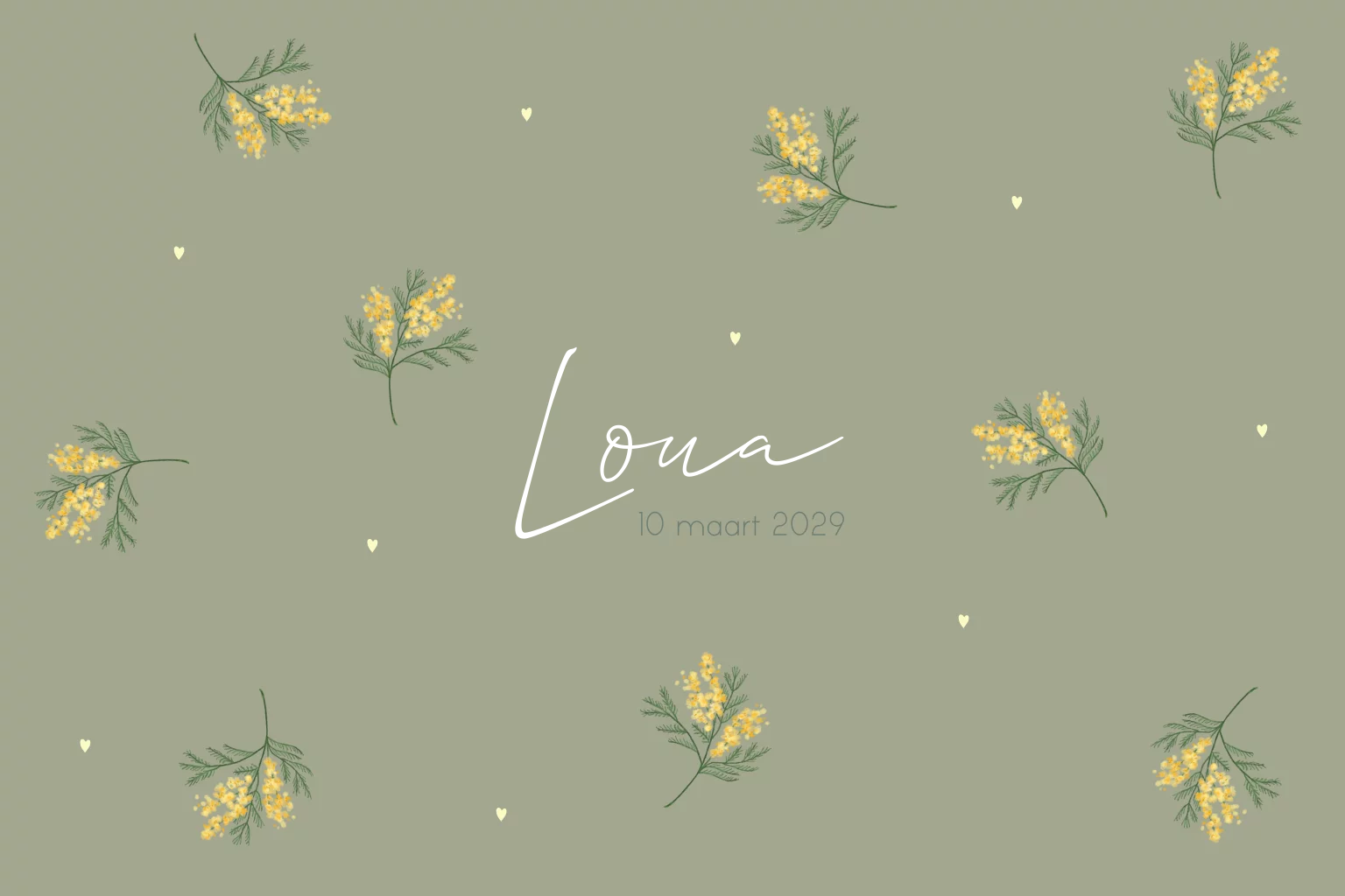 Een mooi en zonnig geboortekaartje voor een meisje met handgetekende mimosa bloemen en hartjes. (30143)
