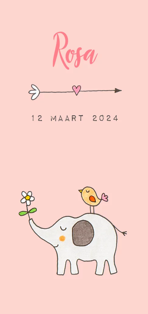 Een lief getekend geboortekaartje voor een meisje met een olifant en een vogel. (6002)