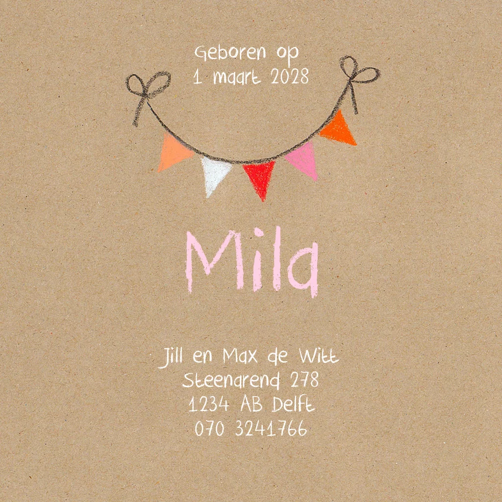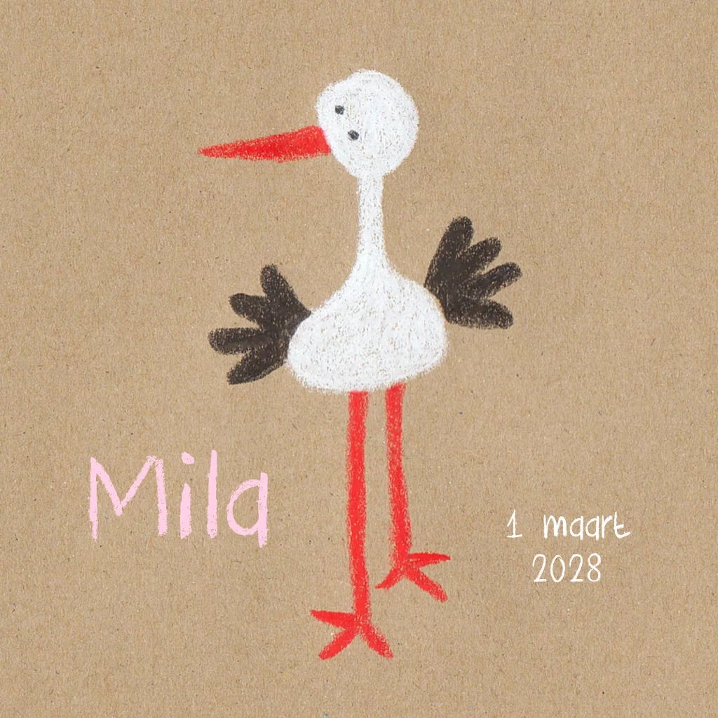 Een geboortekaartje voor een meisje met een ooievaar, getekend met krijt op bruin-look papier. (4476)