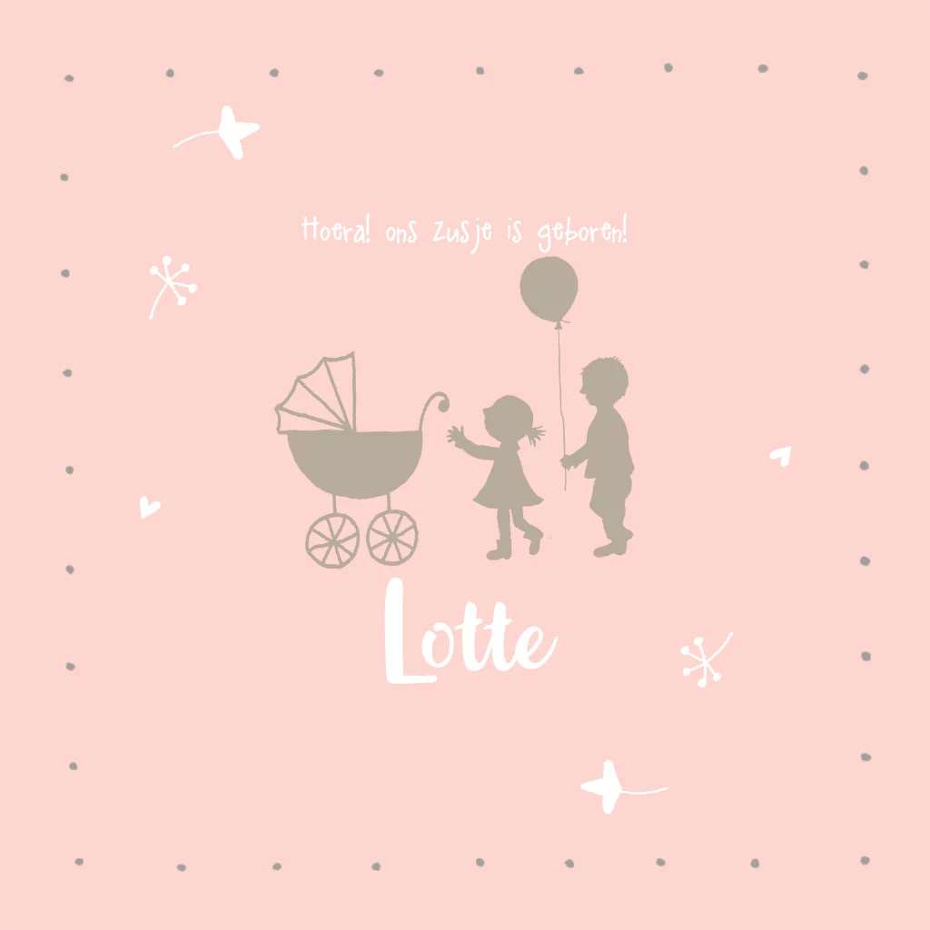 Geboortekaartje meisje kinderwagen silhouet broer en zus