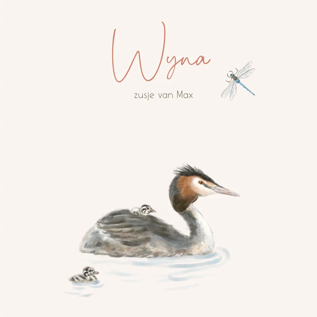 Een 2de baby geboortekaartje voor een tweede kindje met een fuut met twee jongen. (24034)