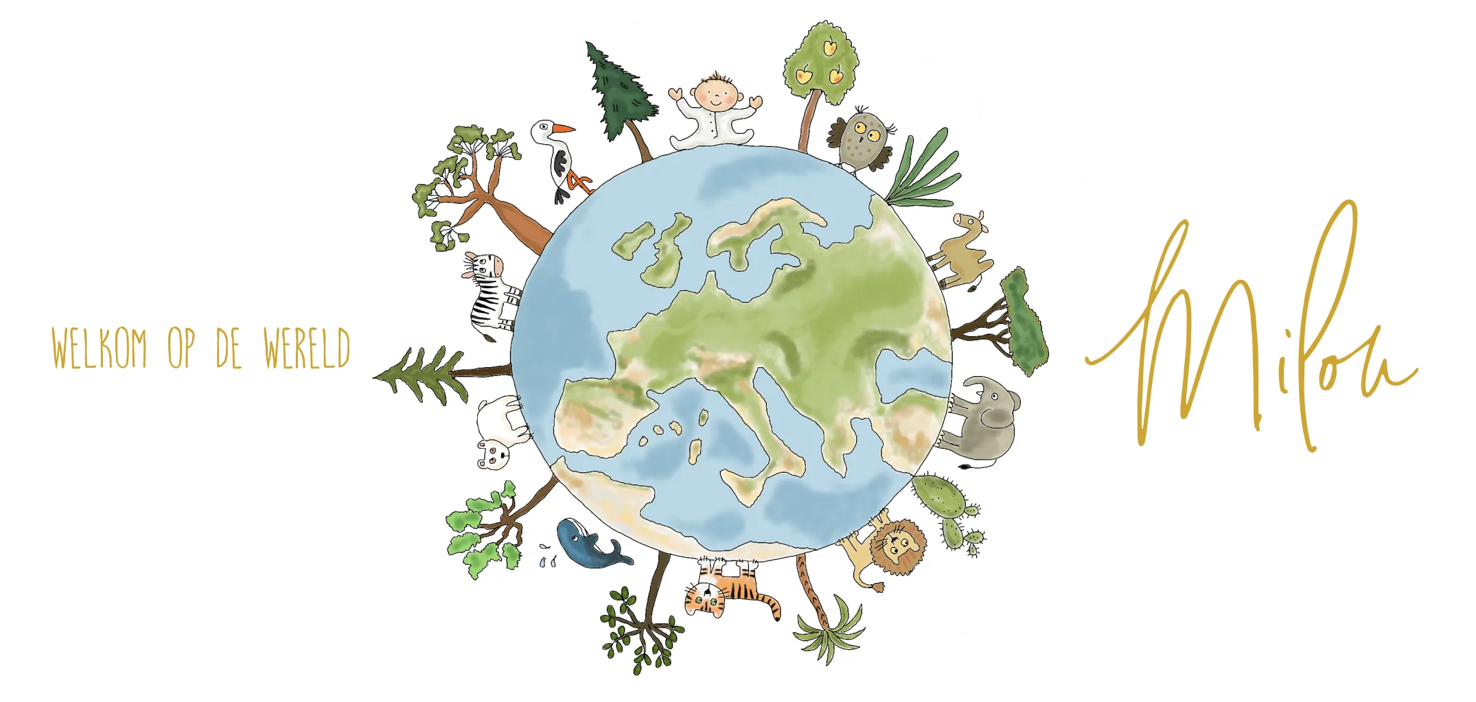 Een leuk getekend geboortekaartje op trendy formaat voor een meisje met wereldbol, baby, planten en dieren. (21064)