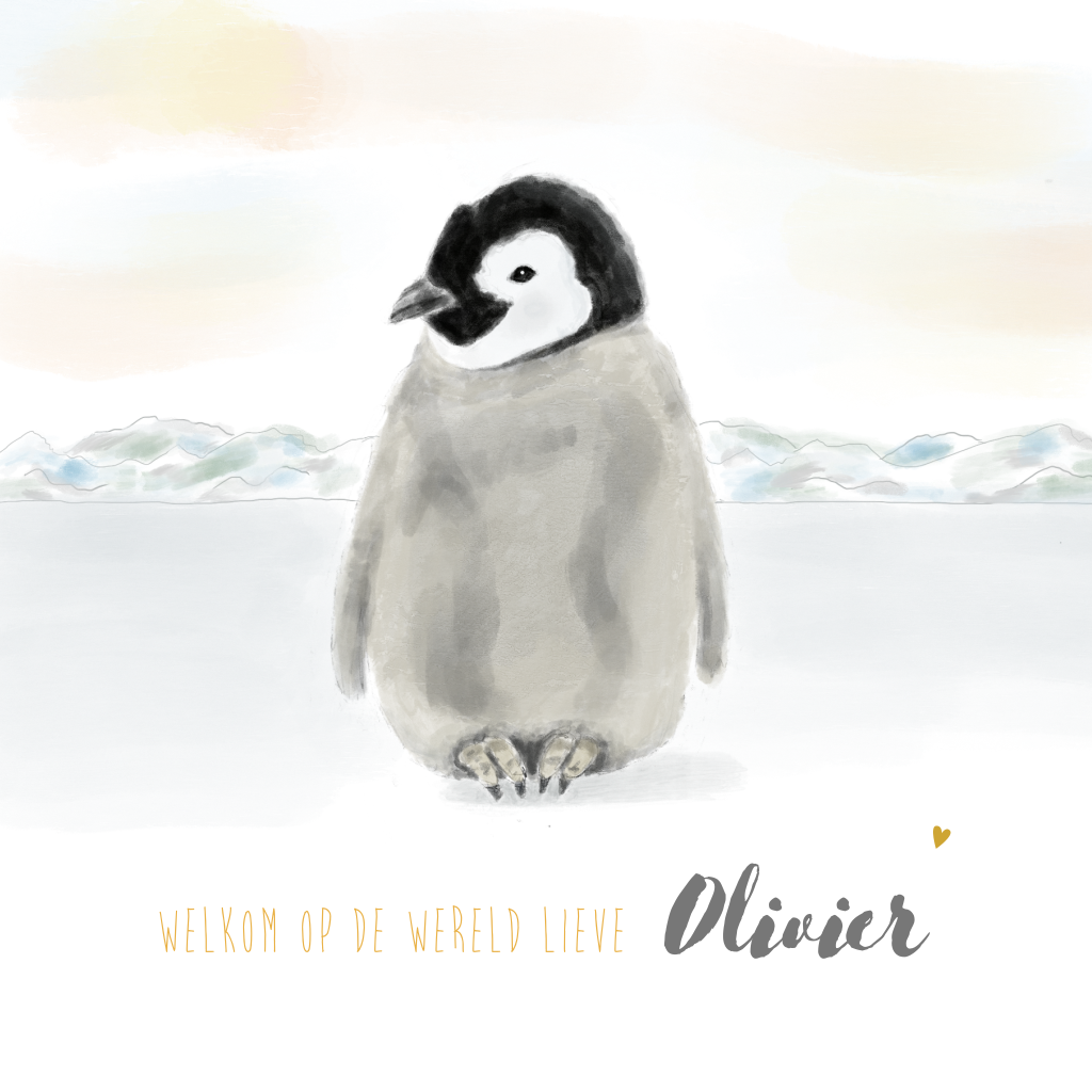 Een prachtig geschilderd, winters geboortekaartje voor een jongen met een pinguïn kuiken in de sneeuw. (21509)
