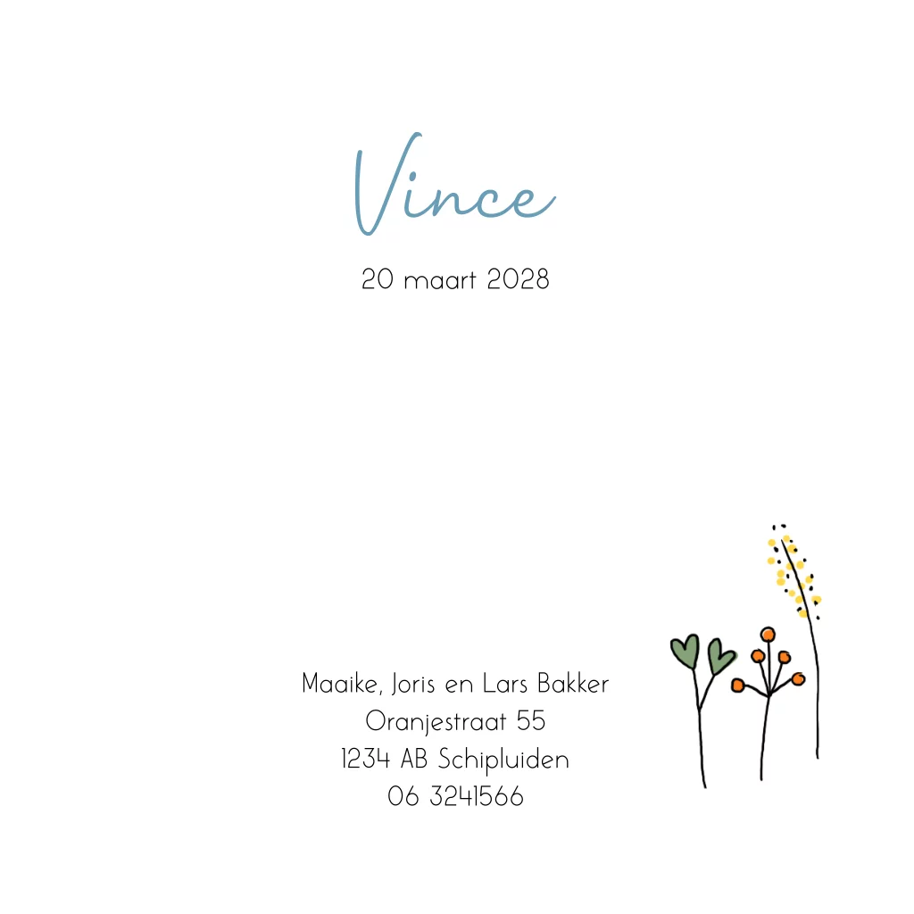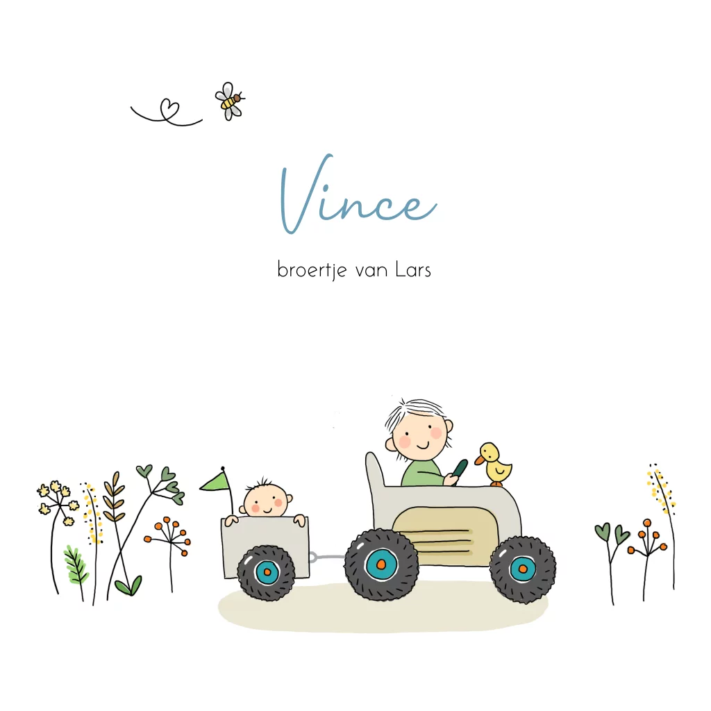 Een tweede kindje geboortekaartje voor een tweede kindje, met tractor en aanhanger. Met leuke details, zoals de plantjes en de bij. (23843)