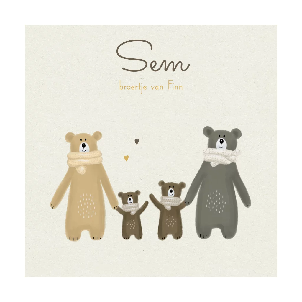 Een vrolijk winters geboortekaartje voor een tweede kindje. Met vier beren met gebreide sjaals. (23557)