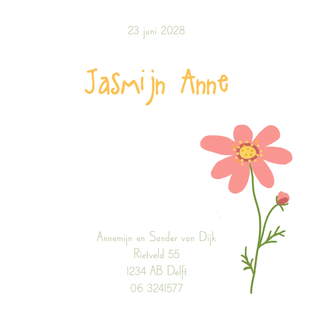 Een modern geschilderd geboortekaartje voor een meisje met felgekleurde bloemen. (23819)