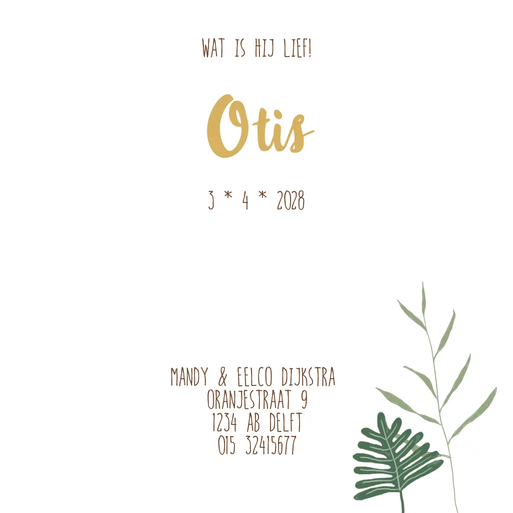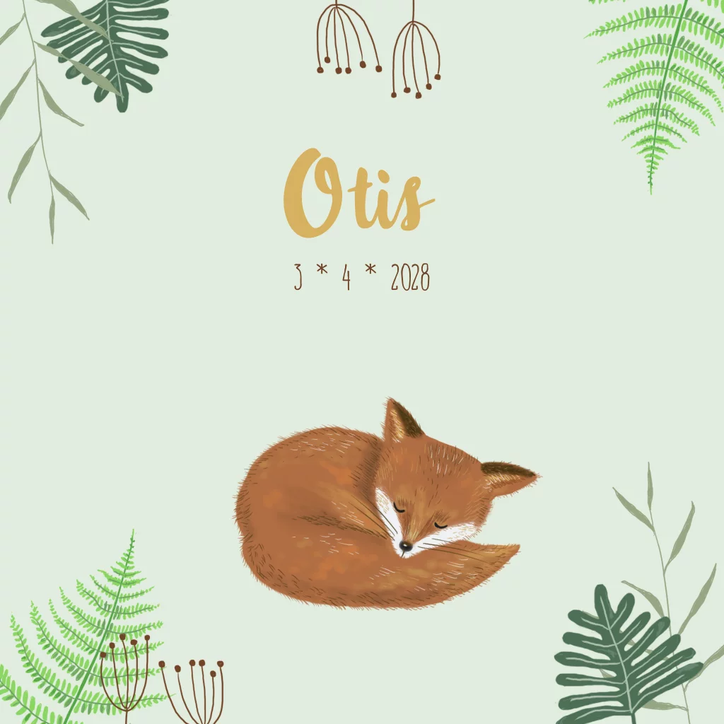 Een getekend geboortekaartje voor een jongen met vosje en varens op een zacht groene achtergrond. (20752)