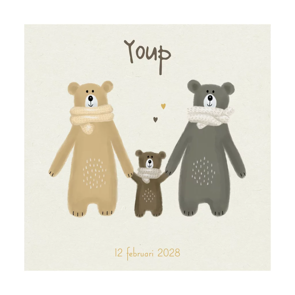 Een vrolijk winter geboortekaartje voor een jongen met vader, moeder en baby-beer met gebreide sjaals. (23555)