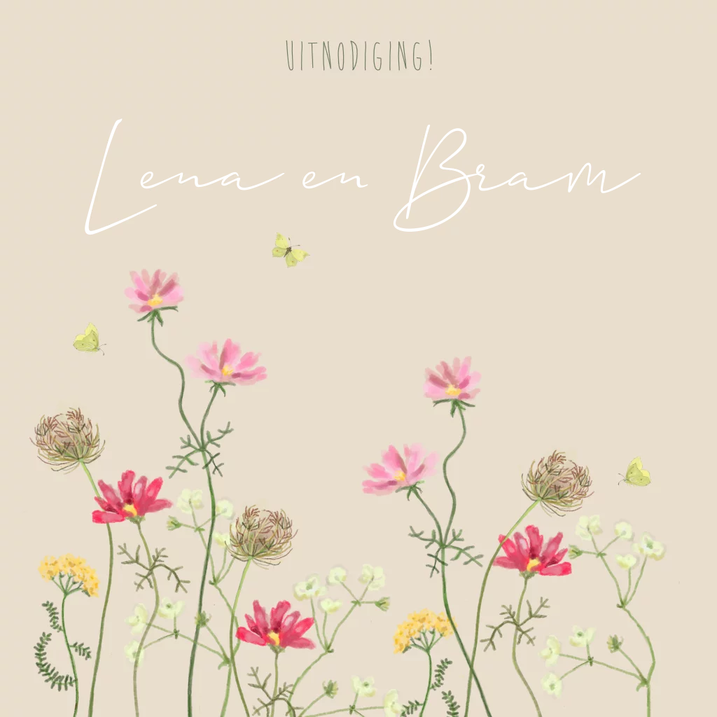Een mooie, vrolijke jubileumkaart met veldbloemen en Citroenvlinders, in roze en geel. De namen zijn gedrukt in goudfolie. (24077)