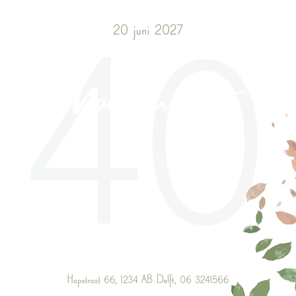 Een hippe jubileumuitnodiging voor een 40 jarig huwelijksfeest met roze en groene bladeren en roze folie in de namen. (23254)