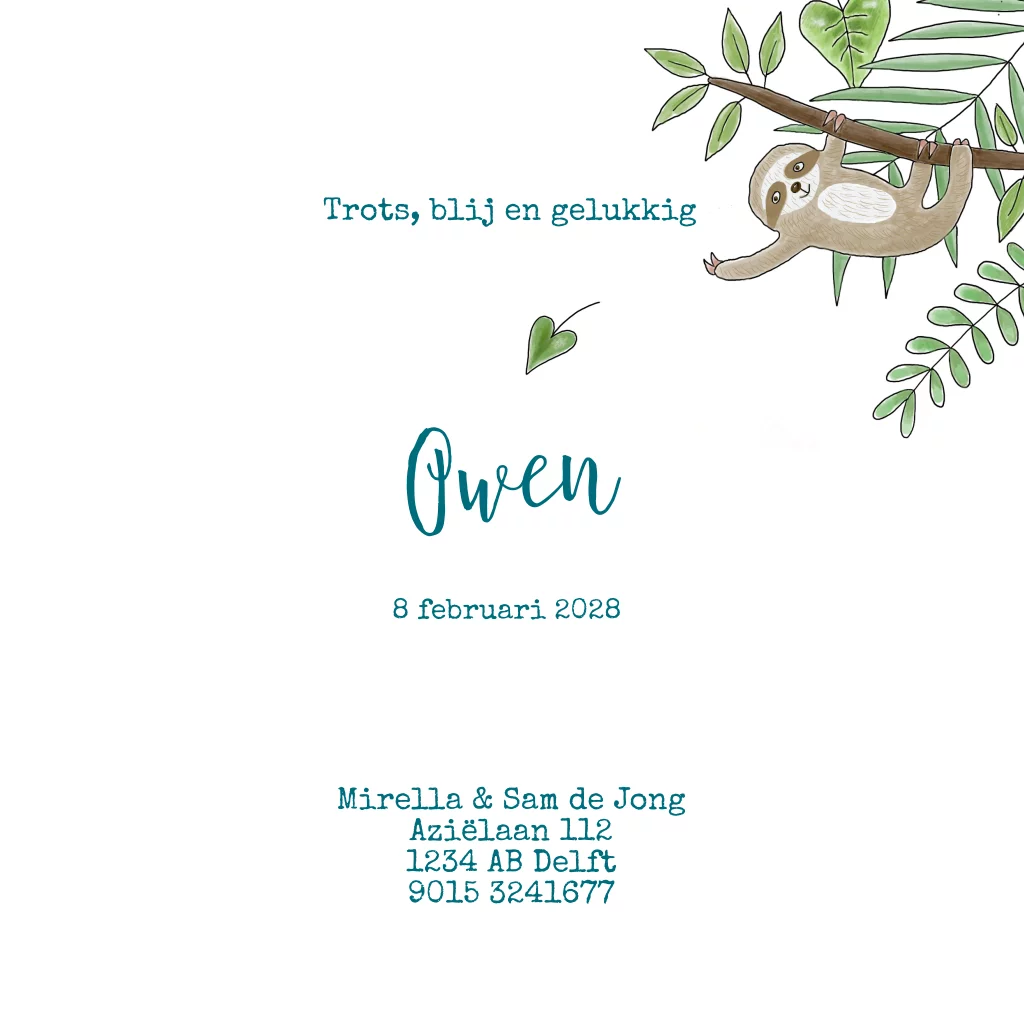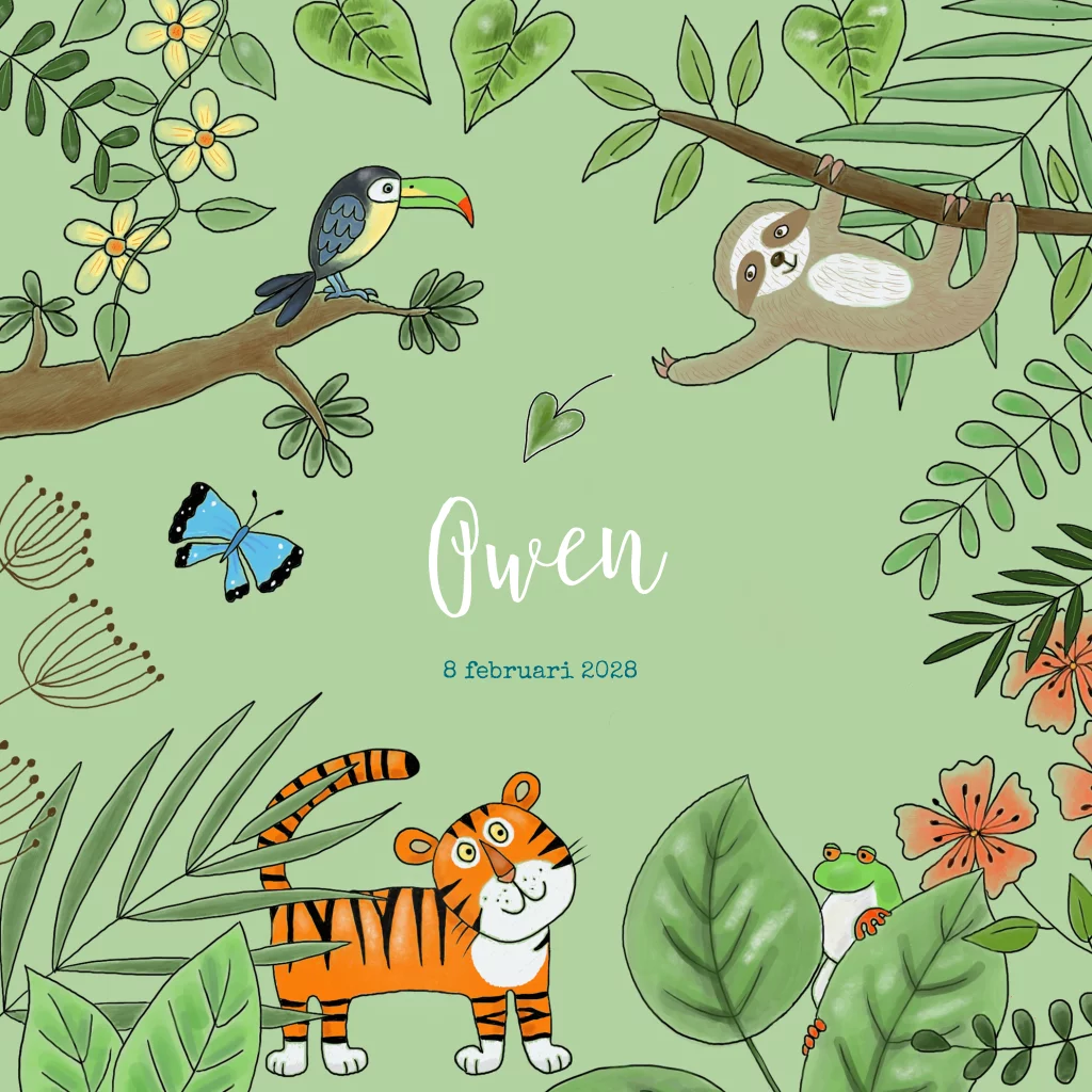 Een met de hand getekend jungle geboortekaartje voor een jongen. Met tijger, toekan, luiaard, kikker en vlinder. De achtergrondkleur is naar wens aan te passen in onze kaartenmaker. (8066)