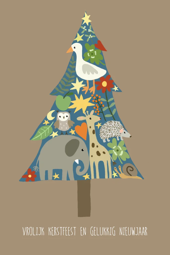 Kerstkaart boom met dieren op bruin