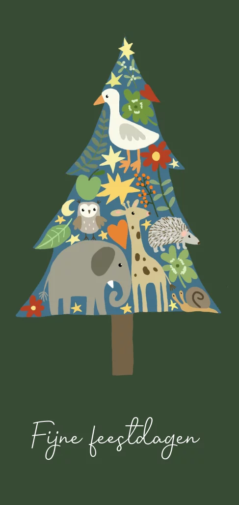 Een vrolijke kerstkaart met een kerstboom met dieren, takjes en sterren. (24133)