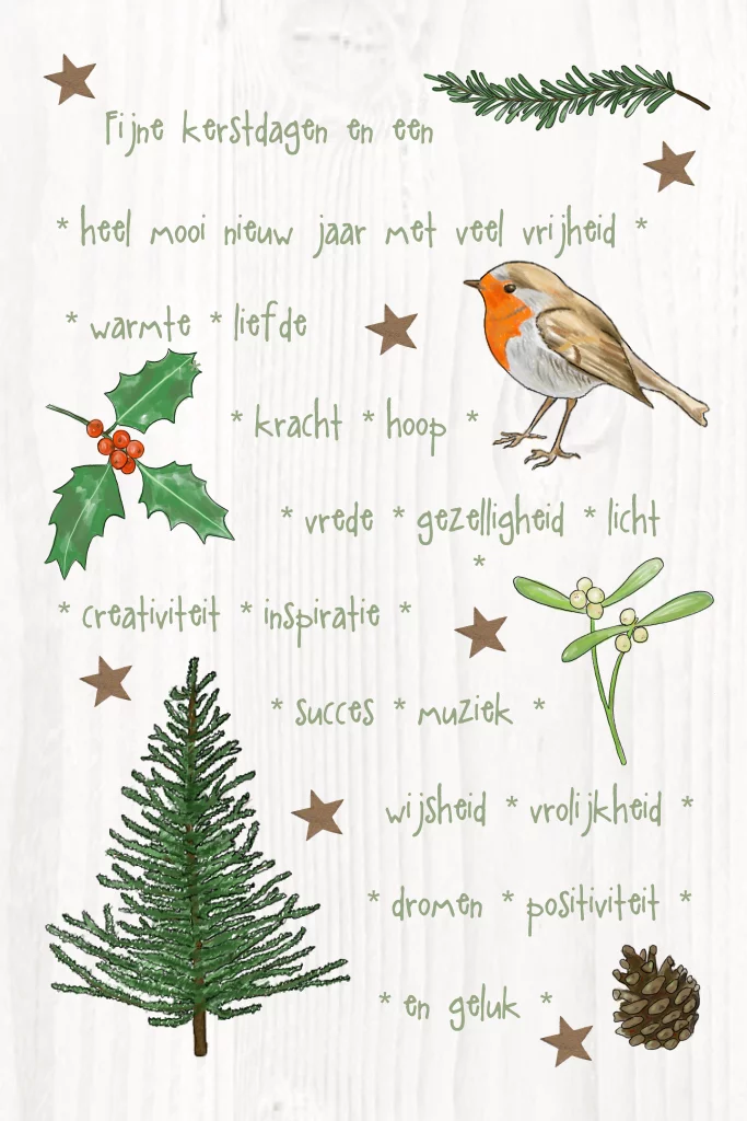 Een bijzondere kerstkaart met kleine illustraties en een hele lange kerstwens op een houtlook achtergrond. (7954)