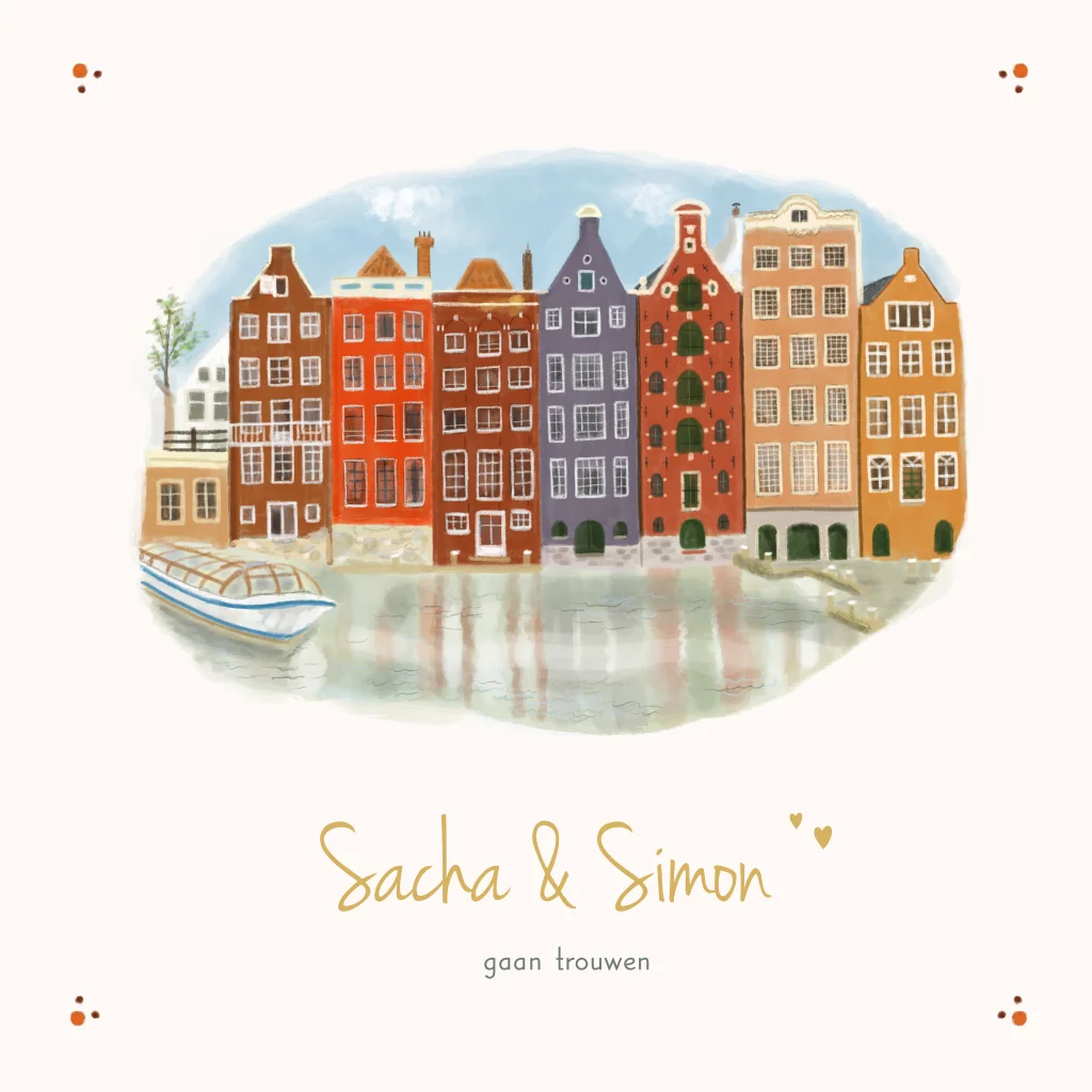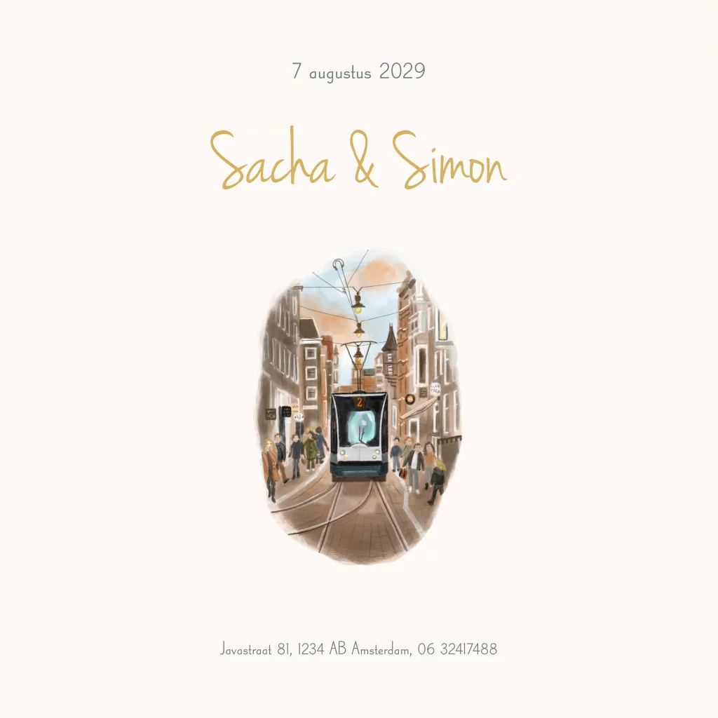 Een mooie sfeervolle trouwkaart met het tekening van het Damrak in Amsterdam. Aan de binnenzijde een afbeelding van tram 2 in Amsterdam. Geschilderd in gouache. (30148)