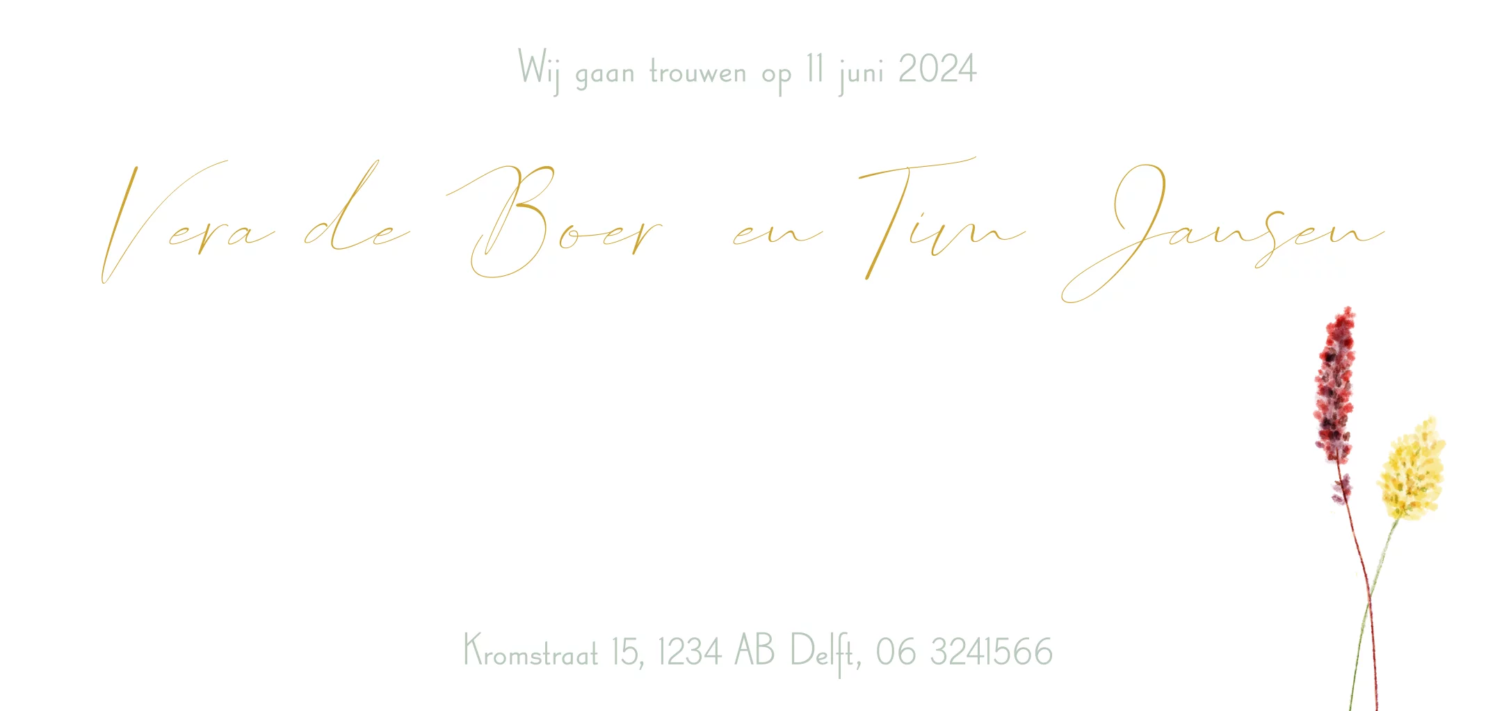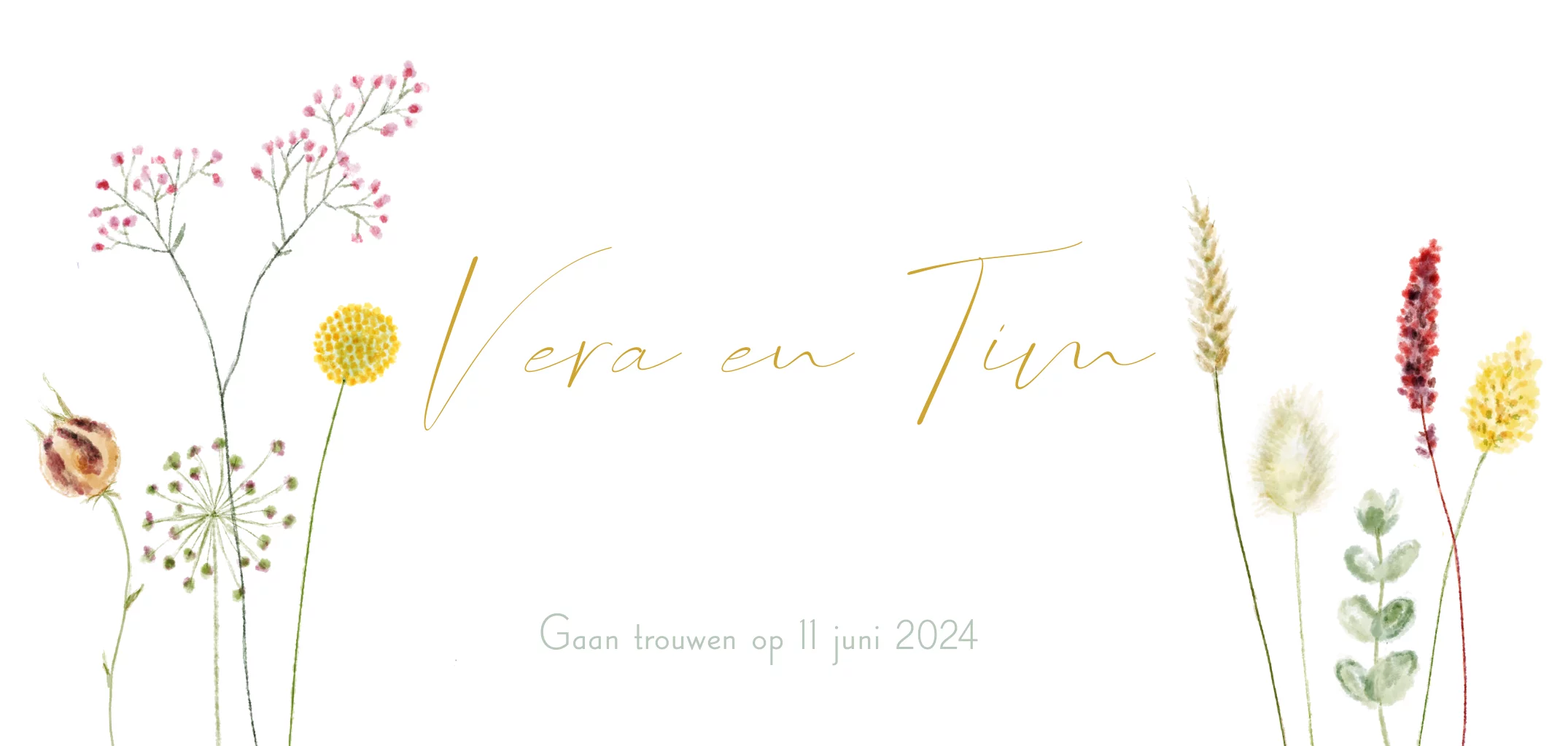 Een mooie, stijlvolle trouwkaart met bloemen in geel en roze geschilderd. (22165)