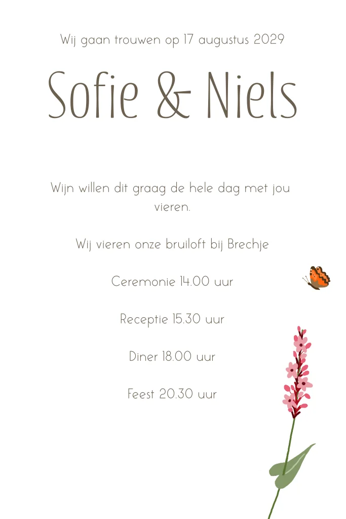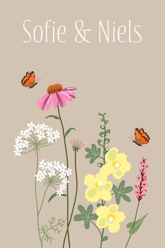 Een kleurrijk getekende trouwkaart met wilde bloemen en vlinders. Wilde Peen, Rode Zonnehoed, Stokroos en Duizendknoop. De vlinder is de Kleine Vos. De kleur van de achtergrond is naar wens aan te passen (24712)