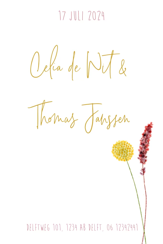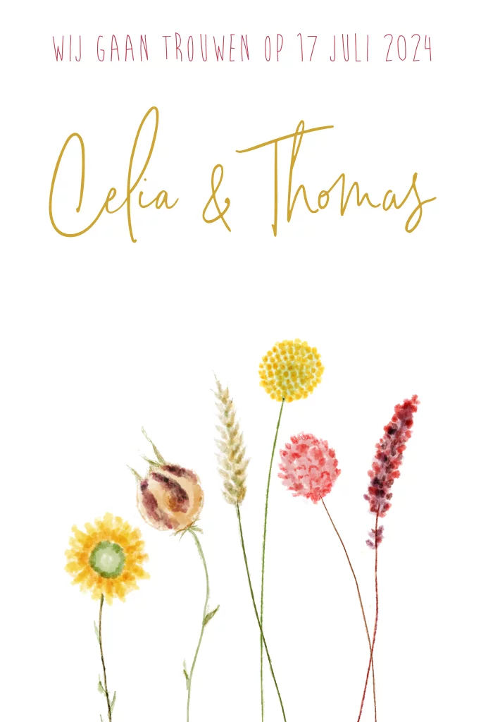 Een mooie, feestelijke trouwkaart met droogbloemen in roze en geel in aquarel. (21291)