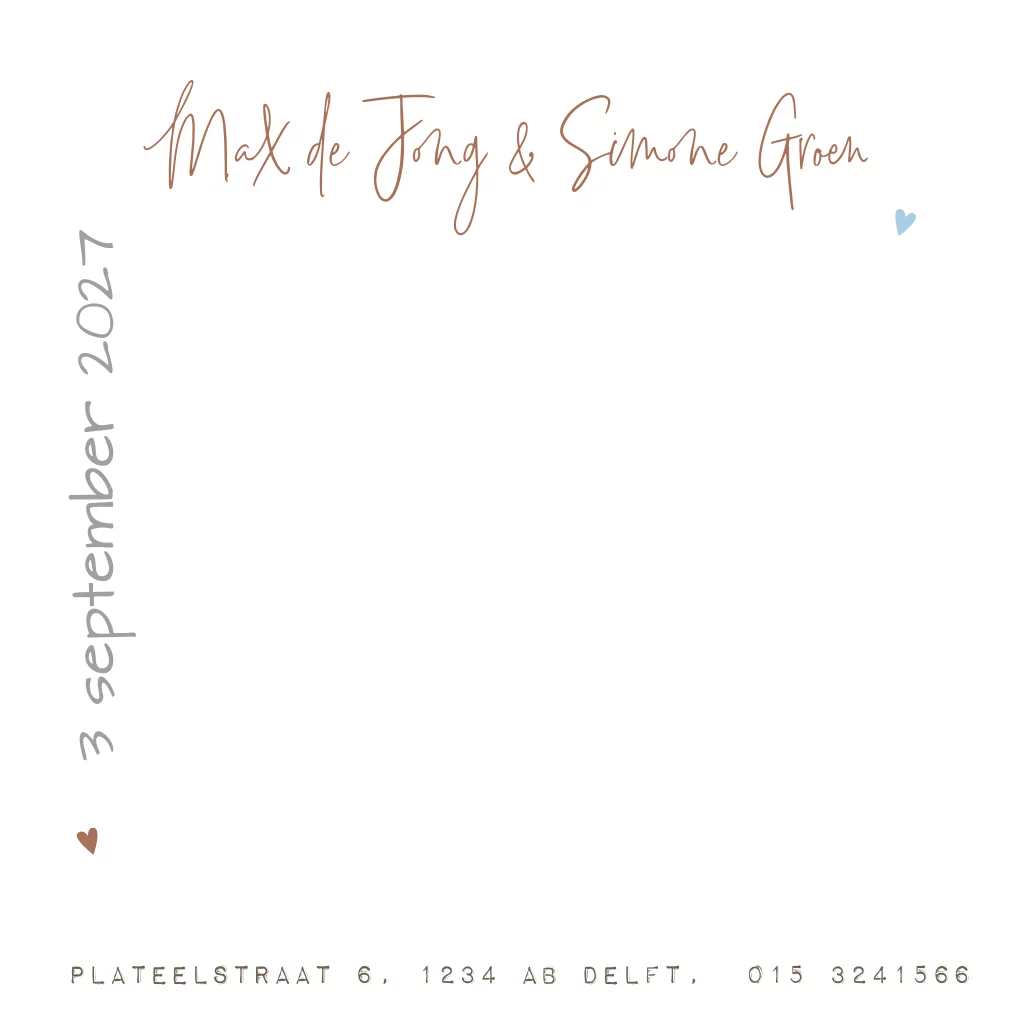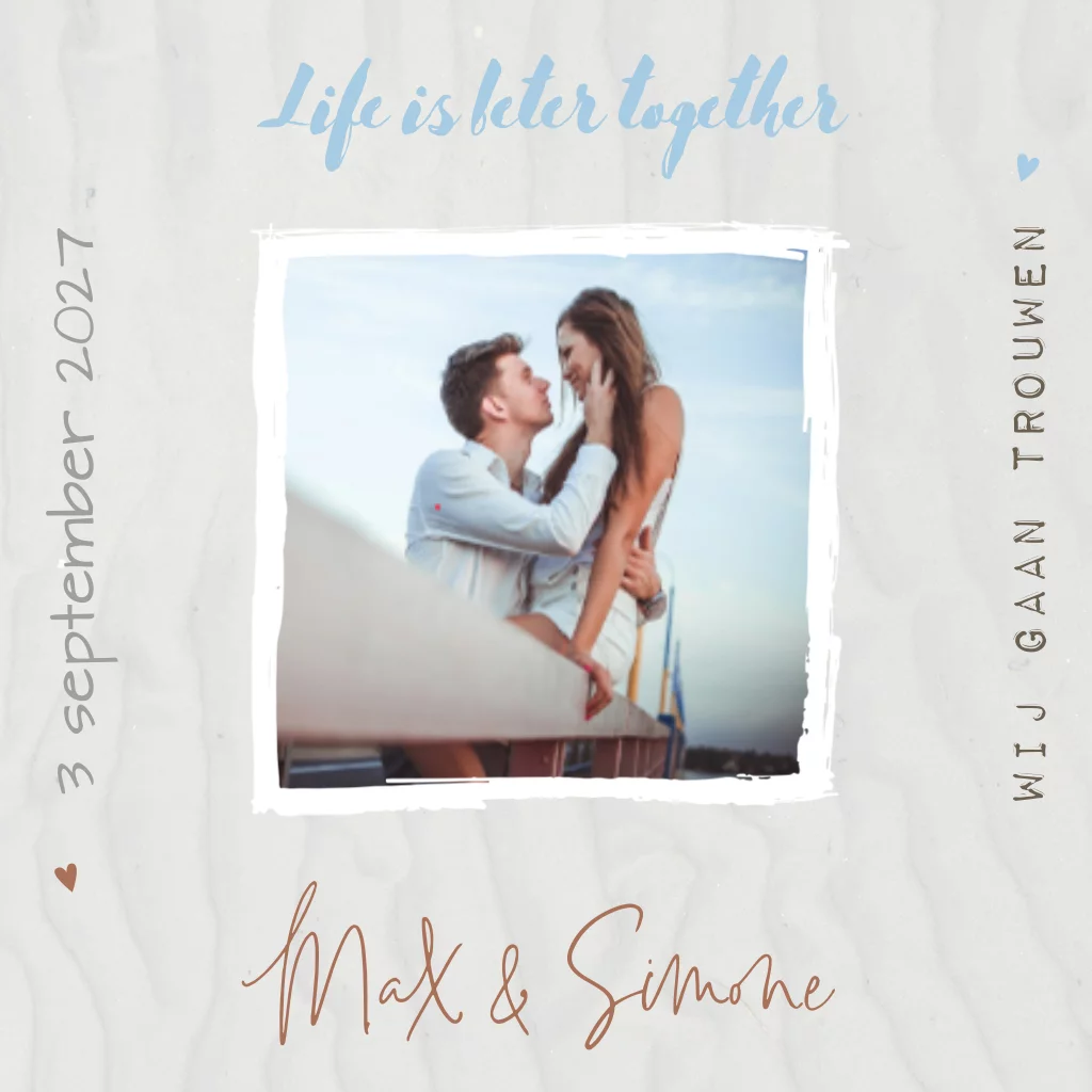 Een hippe trouwkaart met ruimte voor een eigen foto. Op de achtergrond van de kaart staat zand. Een geweldige trouwkaart voor een bruiloft in thema zon zee en strand. (21047)