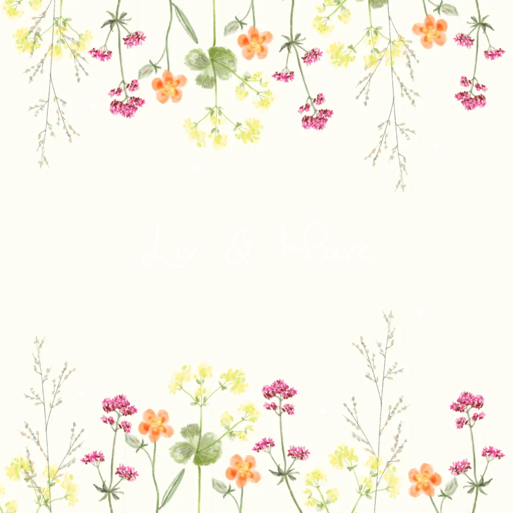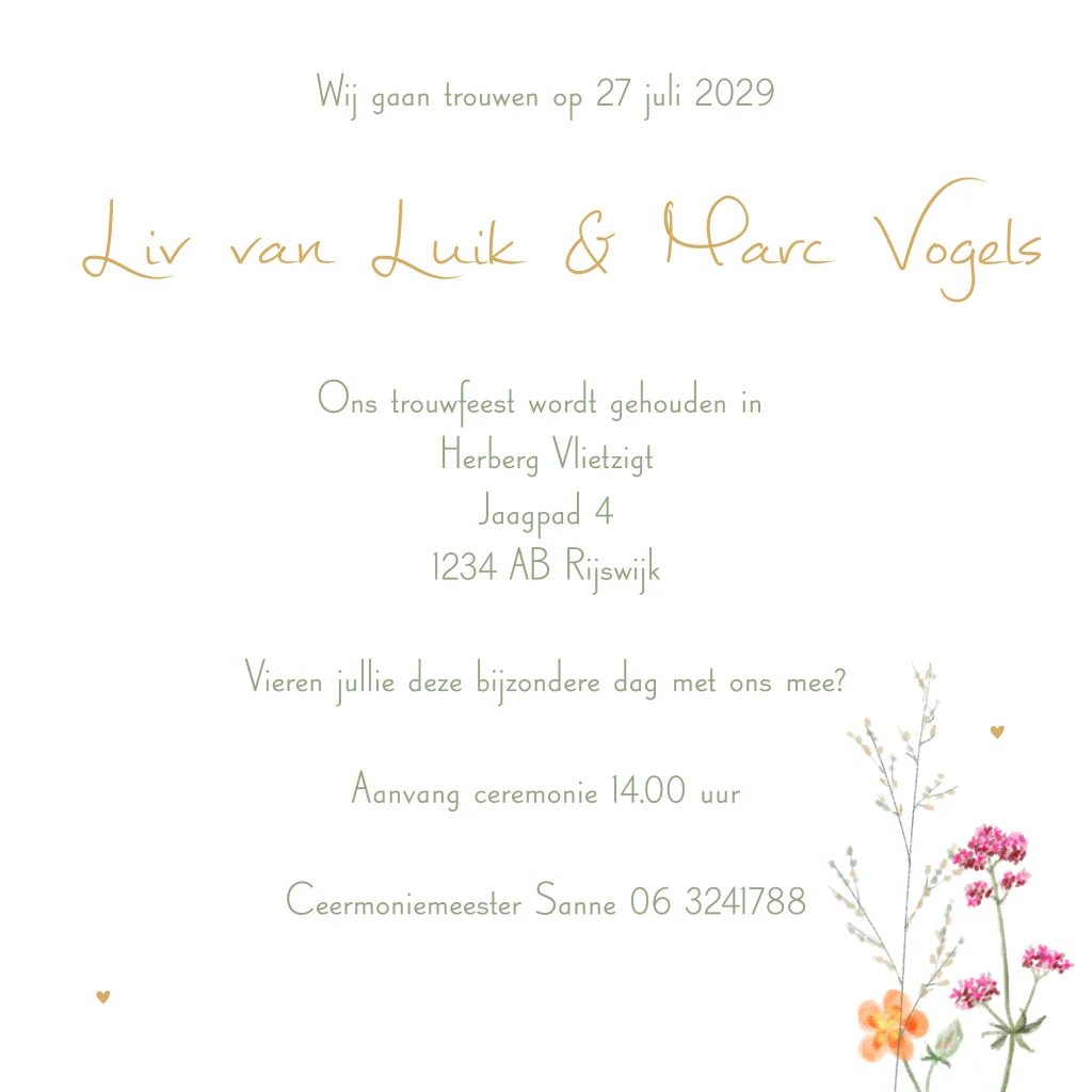 Een verfijnde trouwkaart met handgeschilderde bloemen in frisse kleuren als geel, roze en oranje. De namen en hartjes zijn gedrukt in goudfolie. (24127)