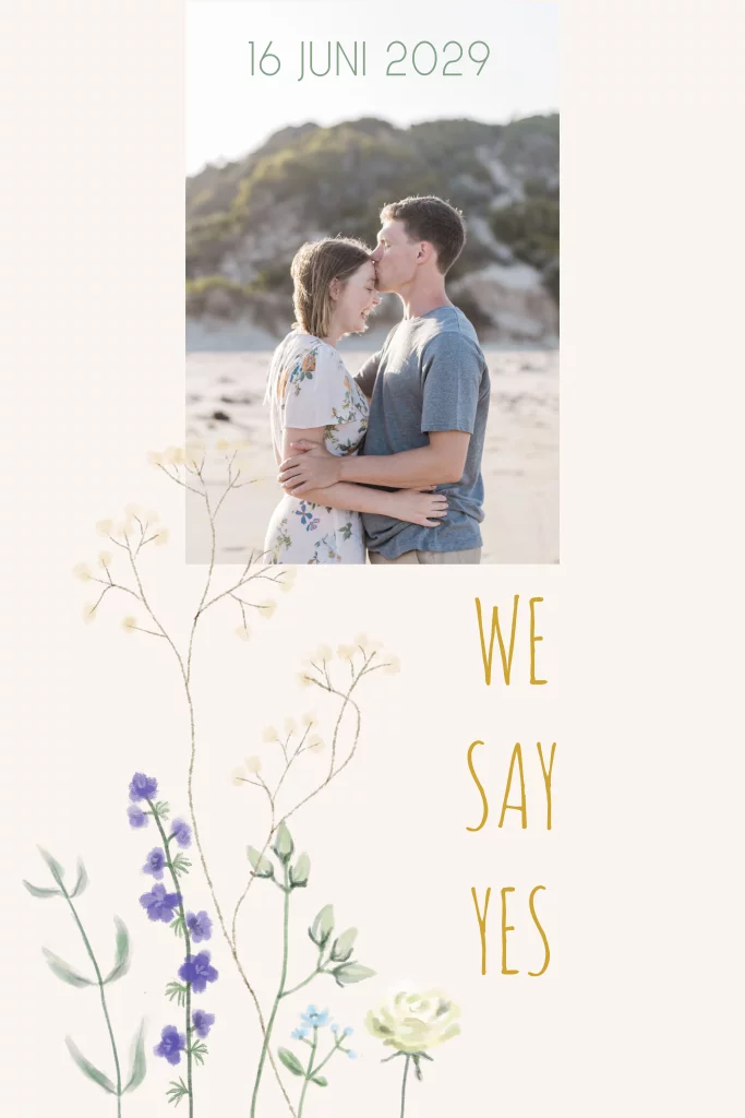 Een mooie trouwkaart met ruimte voor jullie eigen foto en bloemen in blauw, paars en naturel. (24610)