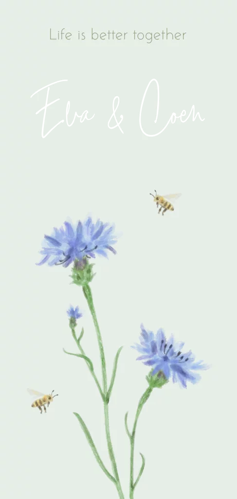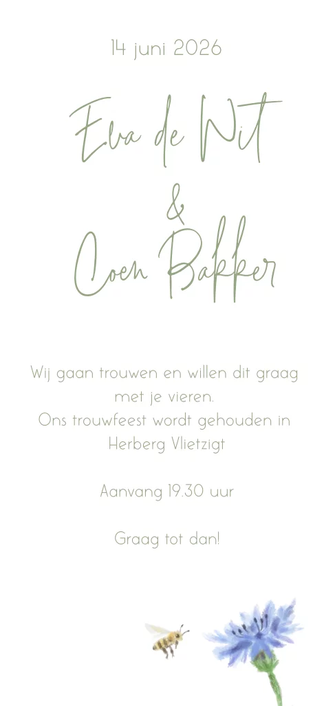 Trouwkaart met korenbloemen en bijen op een zachtgroene achtergrond. Deze kaart is eenvoudig naar wens aan te passen. Met goudfoliedruk. (23198)