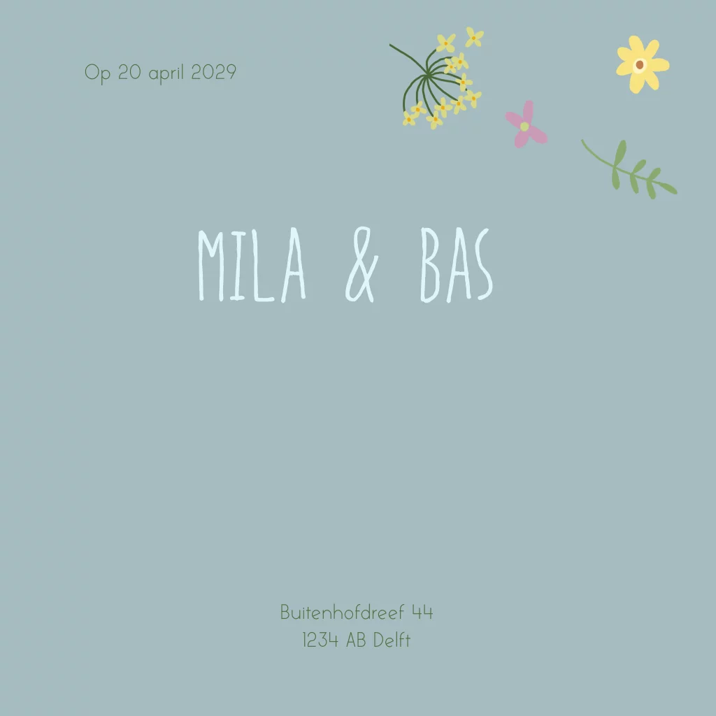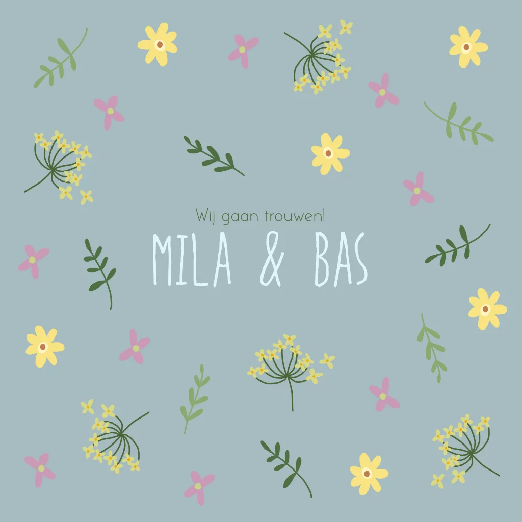 Een frisse trouwkaart met losse gele en roze bloemen op blauwe achtergrond. (24609)