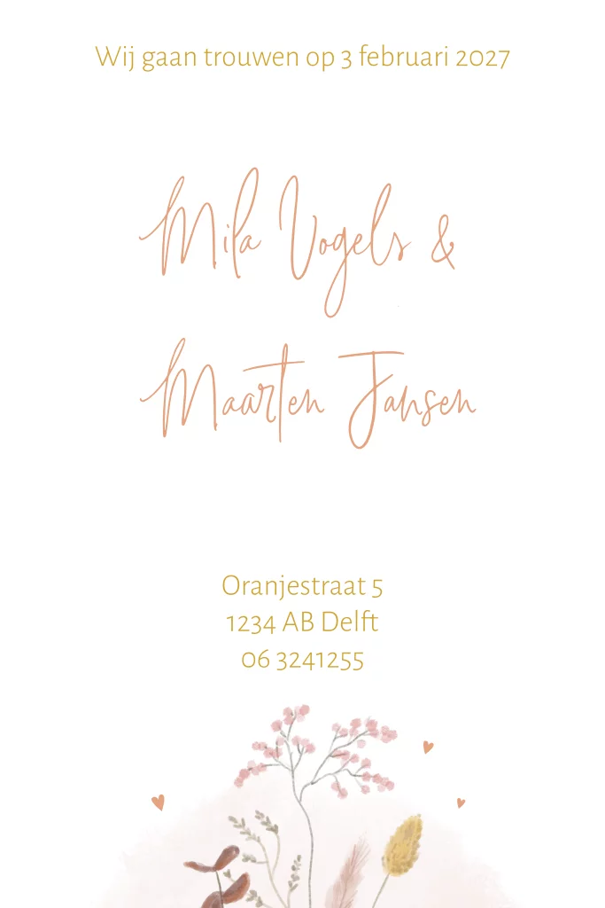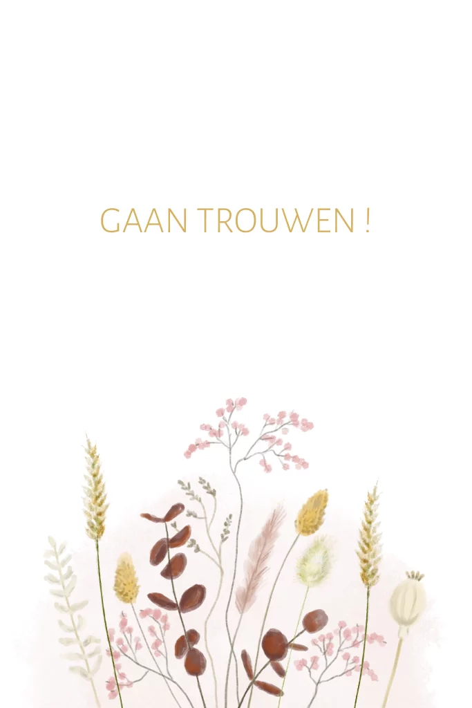 Een mooi geschilderde trouwkaart met roze en gele bloemen. Met rosefolie in de namen. (22965)