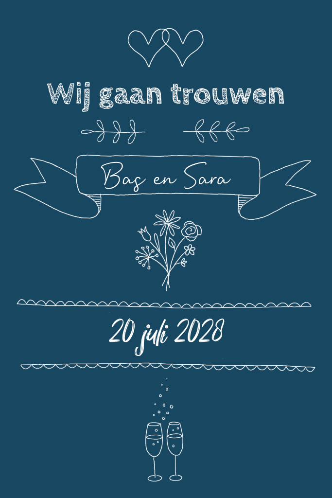Een hippe typografie trouwkaart met illustraties in wit op donkerblauw. (23959)
