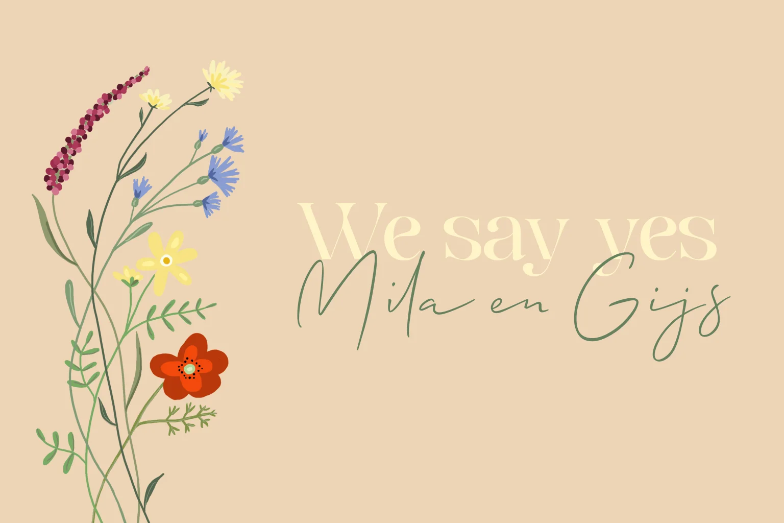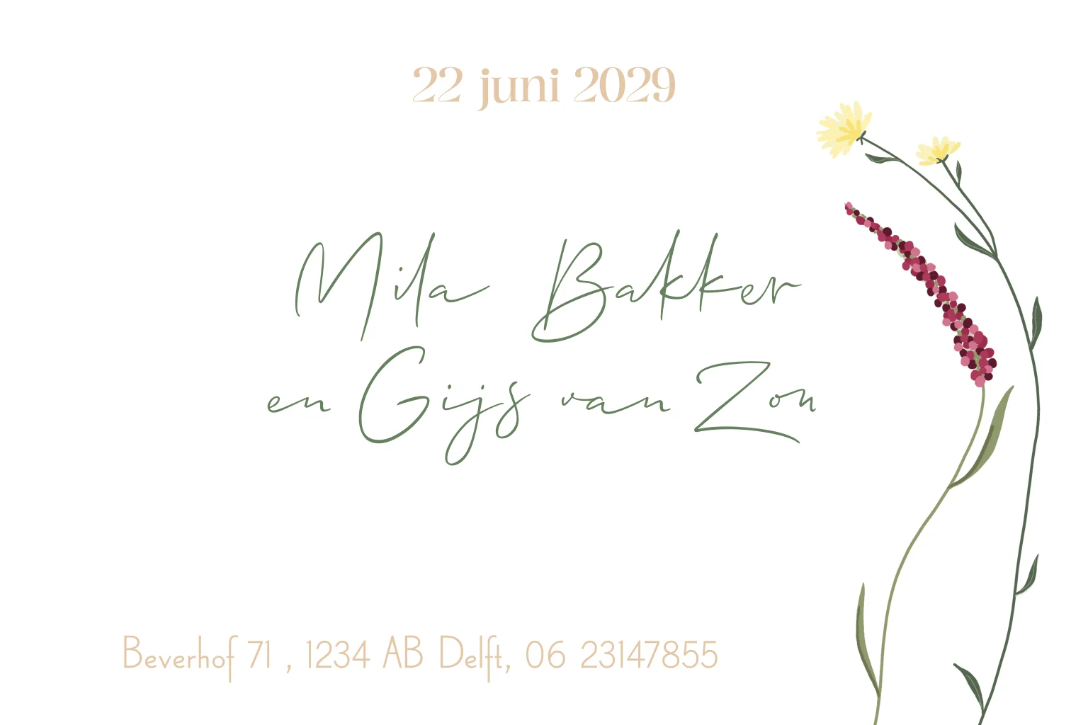 Een vrolijke trouwkaart met veldbloemen in frisse kleuren. (30146)