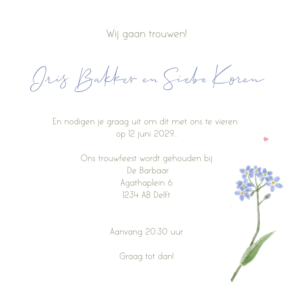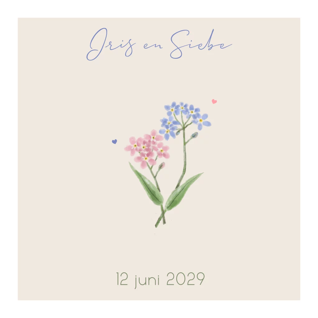Trouwkaart met vergeet mij nietjes bloemetjes in roze en blauw. (30142)