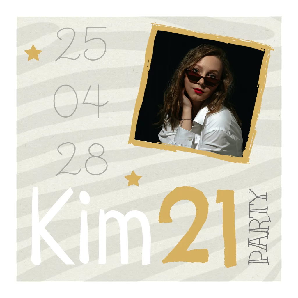 Een super leuke uitnodiging voor een 21 party! Met zebraprint en leuke typografie. Plaats je eigen foto op deze kaart om hem nog persoonlijker te maken. (23631)