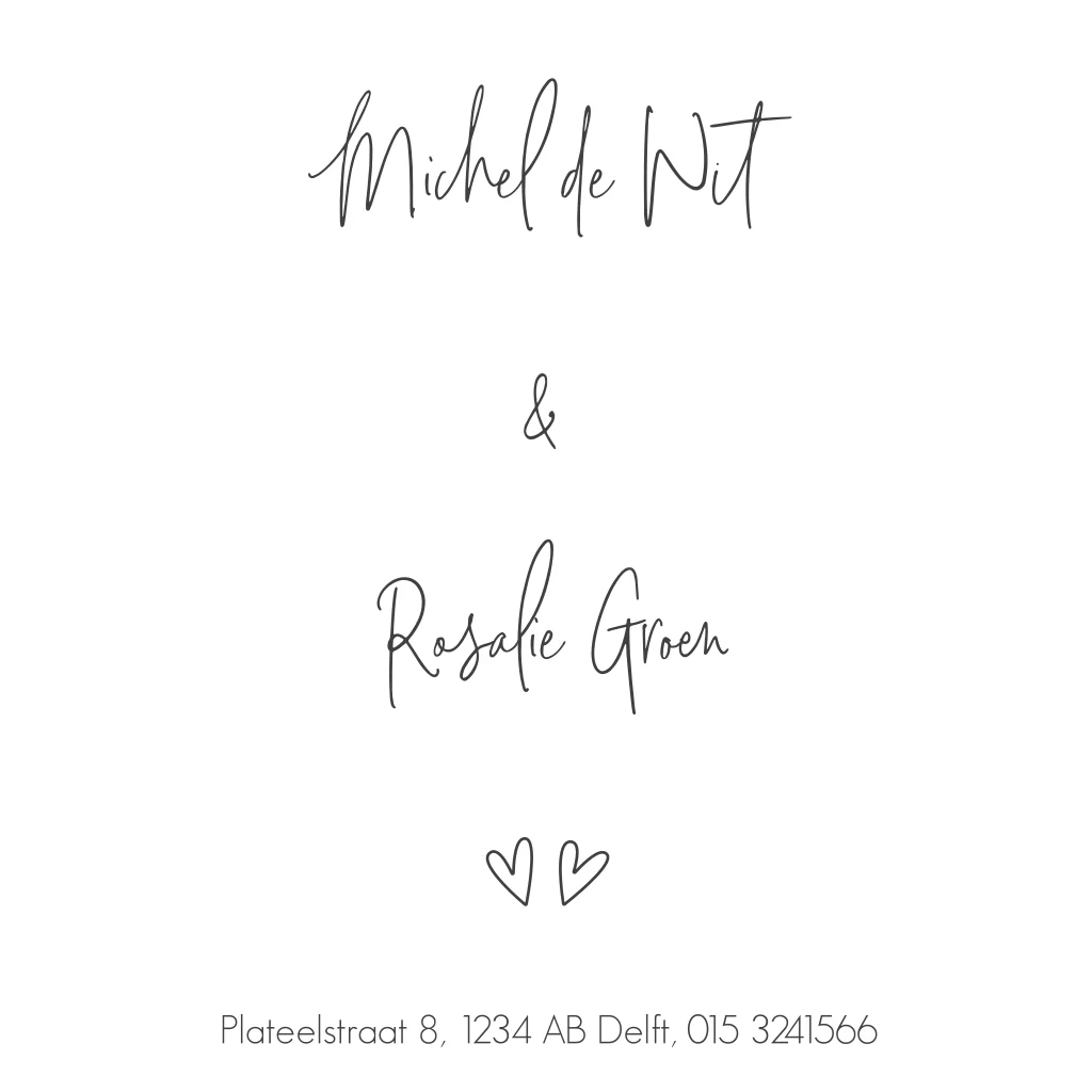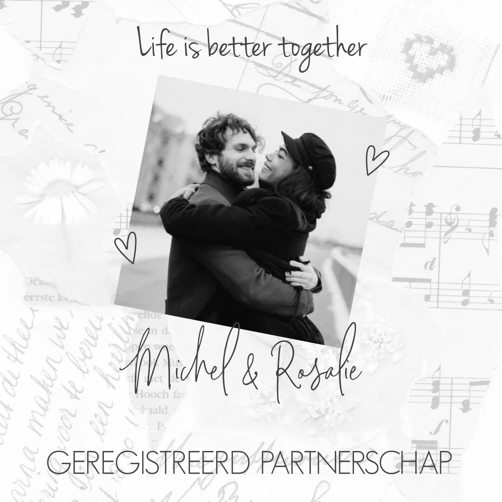 Uitnodiging Partnerschap foto zwart wit met een romantische collage van stukjes tekst en muziek en ruimte voor een eigen foto.(20985)