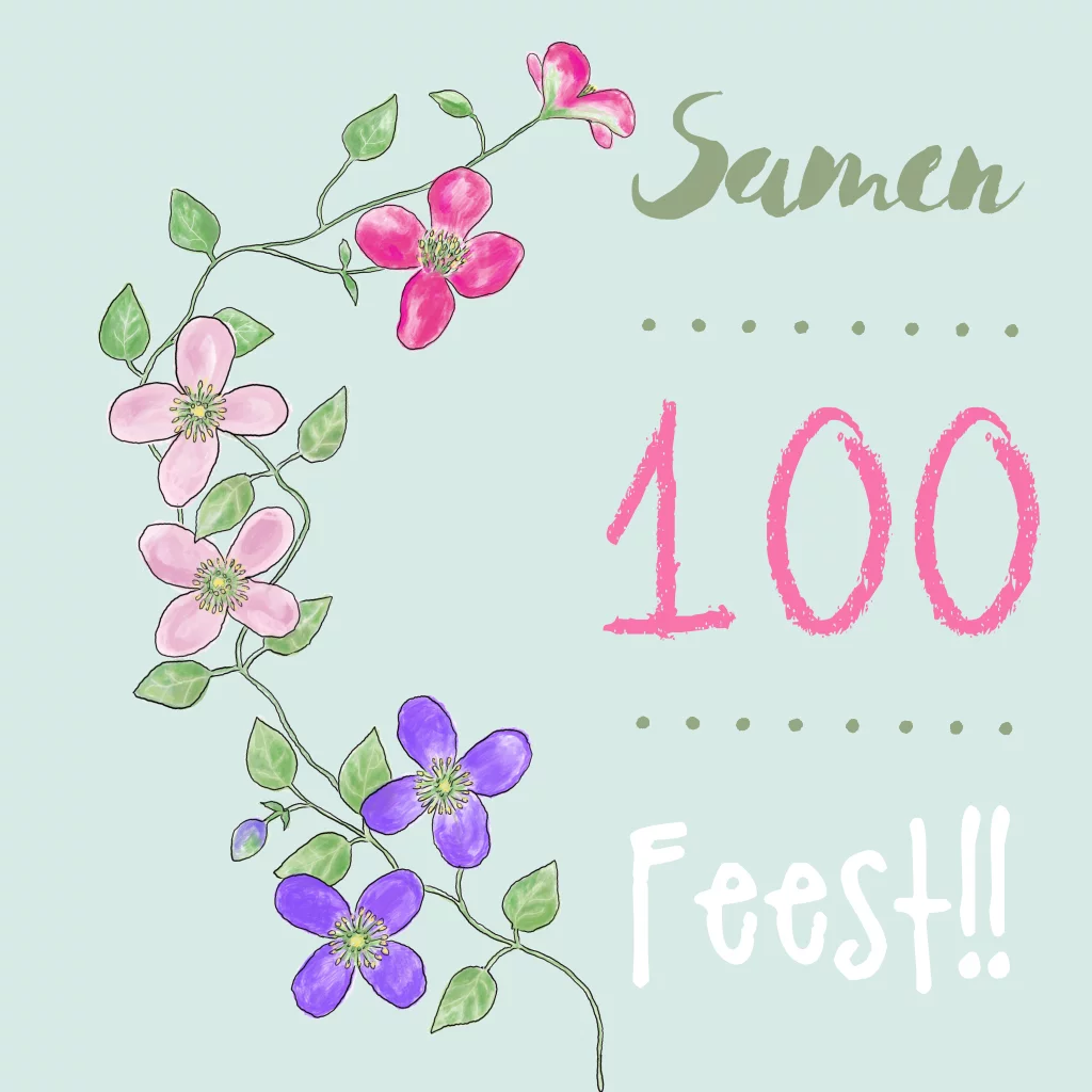 Een frisse verjaardagsuitnodiging voor een dubbel feest 100 jaar met mooi getekende bosrank. De achtergrondkleur is eenvoudig aan te passen in onze kaartenmaker. (7496)