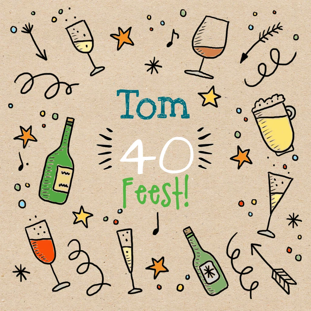 Een hippe verjaardagsuitnodiging voor een 40 jarige, met glazen, slingers en sterren op kraft. (8698)