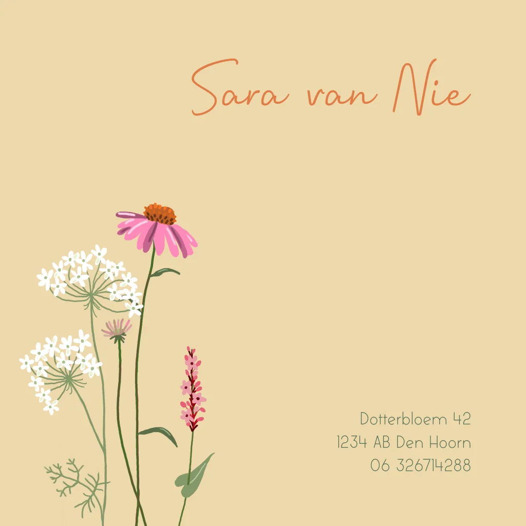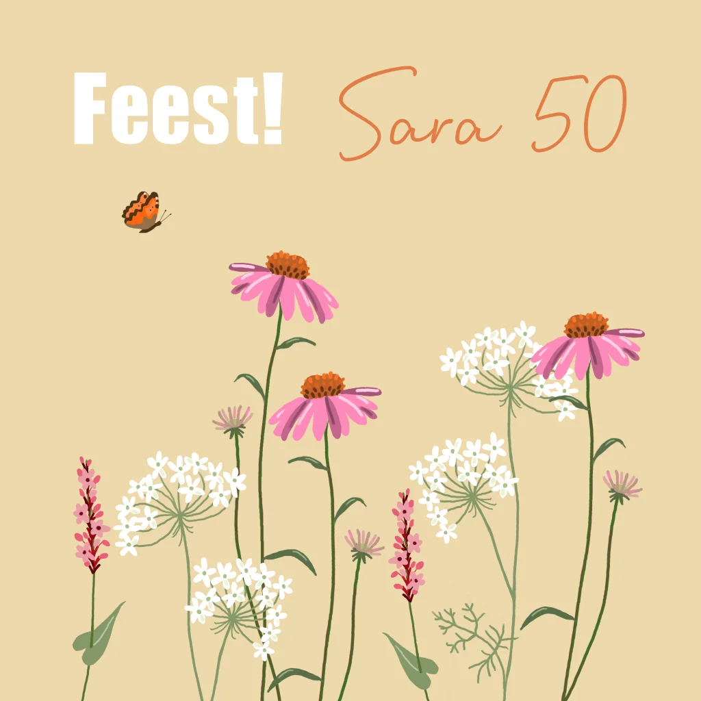Een vrolijke uitnodiging voor een 50 jarige dame met Rode Zonnehoed, Wilde peen en Duizendknoop met erbij een vlinder, de Kleine vos. (24719)