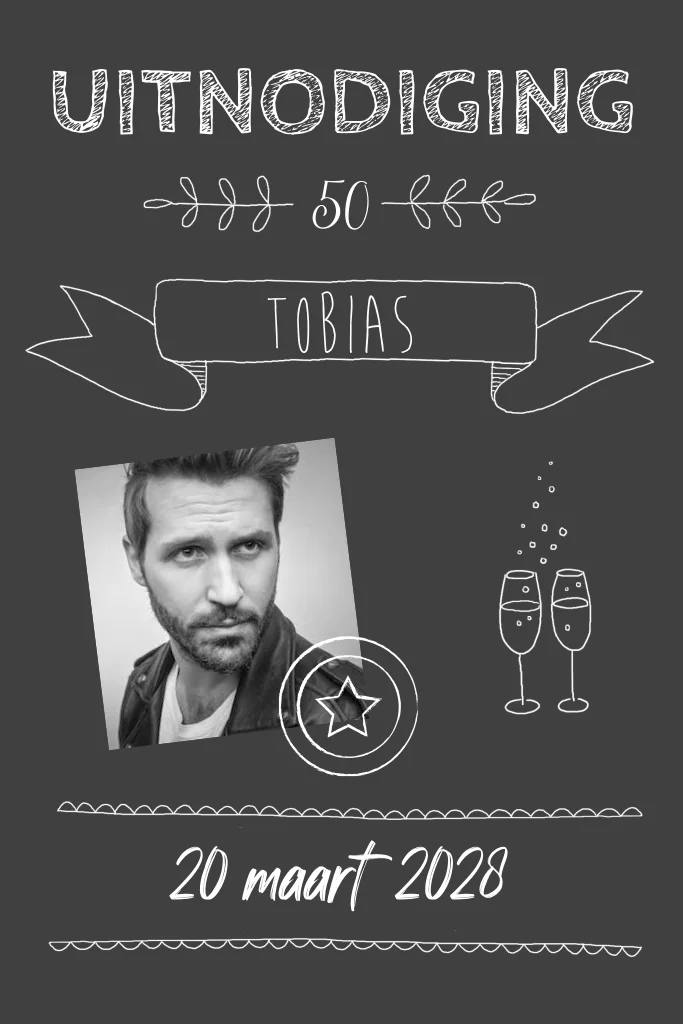 Verjaardagsuitnodiging 50 in zwart wit handlettering