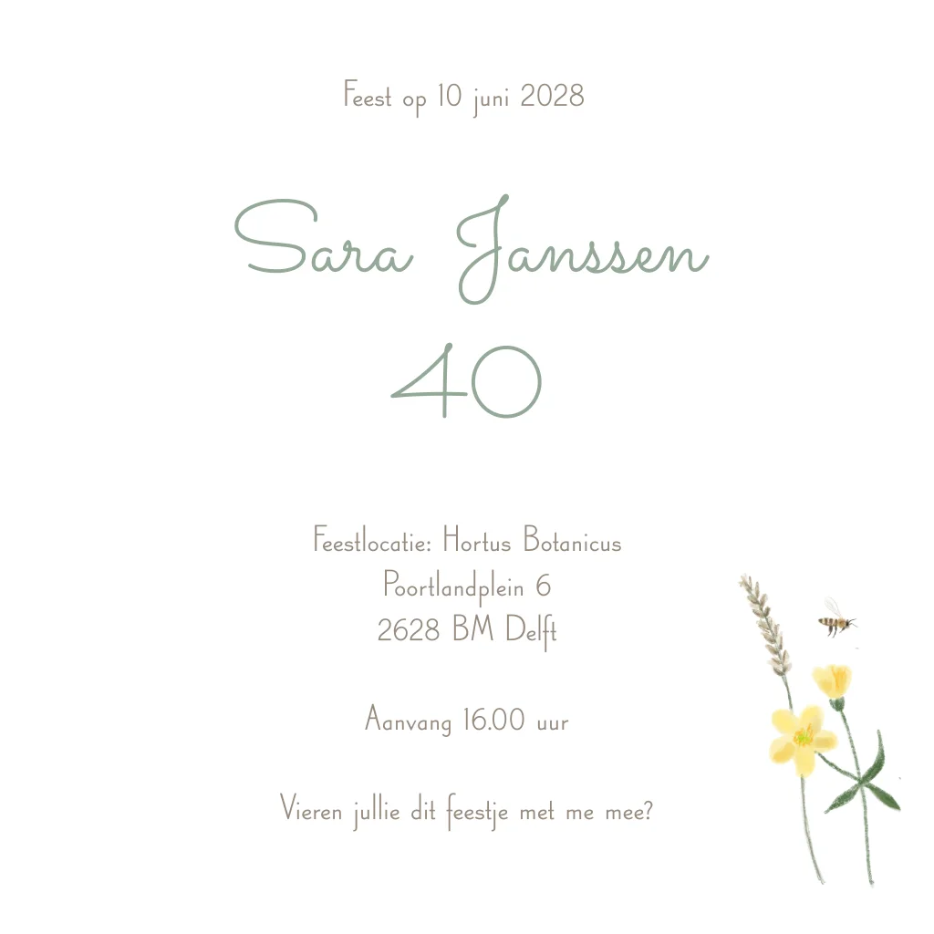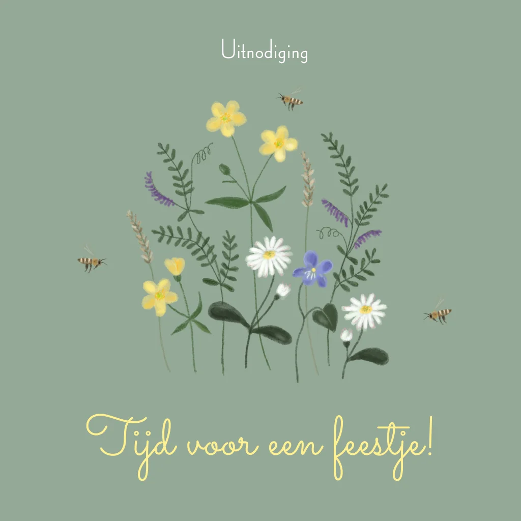 Uitnodigingskaart voor een feestje veldbloemen en bijen