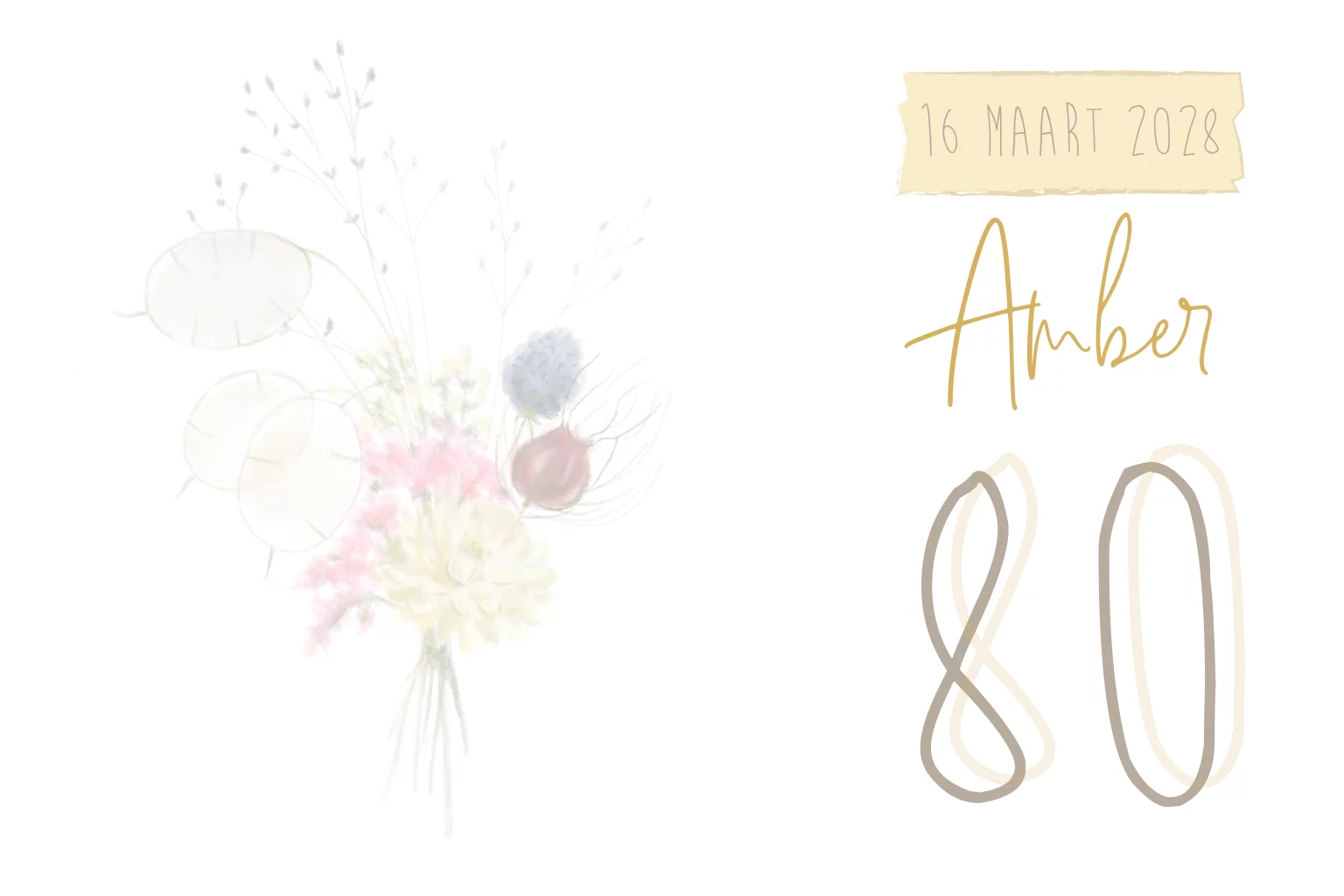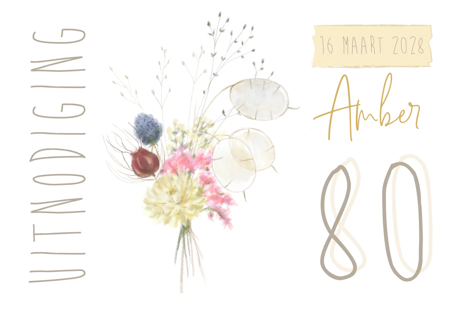 Verjaardagsuitnodiging vrouw 80 droogboeket roze en zand