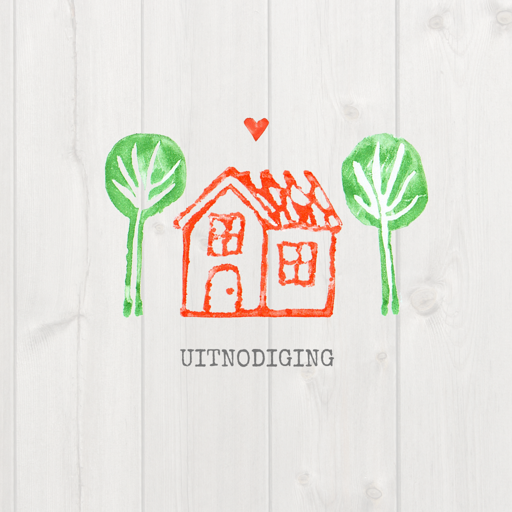 Een originele housewarmingkaart met stempels van huis, hart en bomen op hout. (4460)