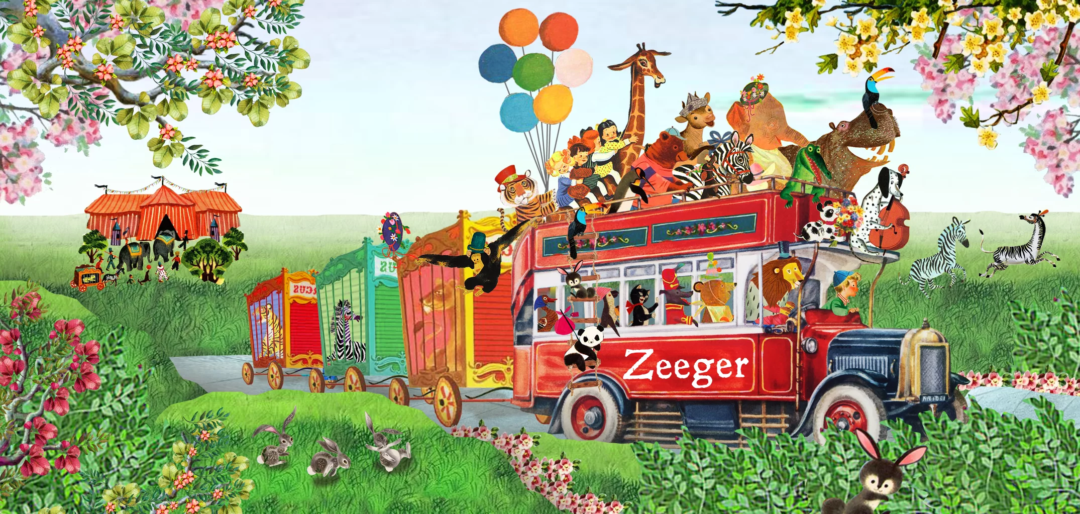 Langwerpige geboortekaart met Circus dieren Parade van 21x10cm. Een heel originele en vrolijke geboorte aankondiging! (7504)