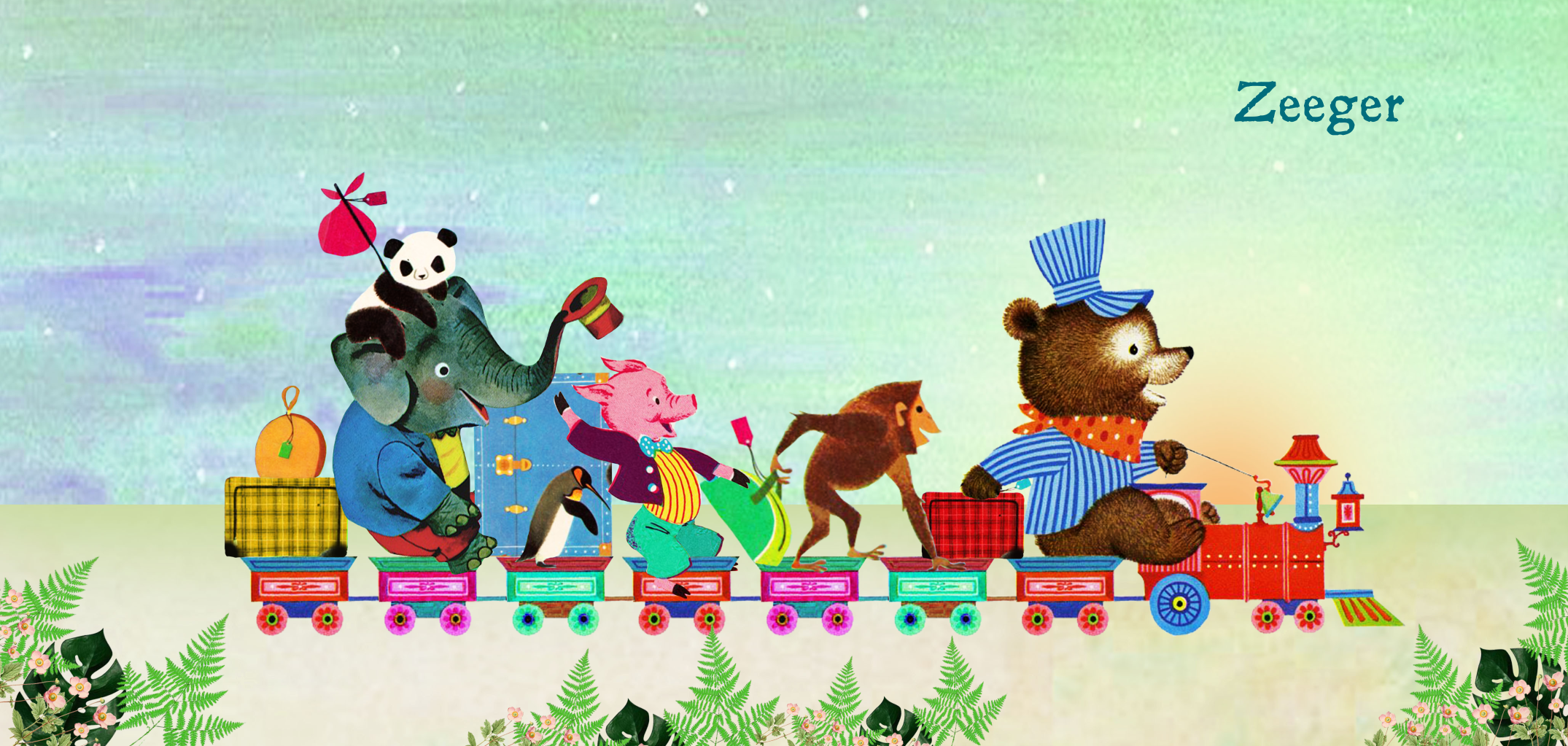 Geboortekaartje voor een jongen. Een bonte verzameling onderweg met de trein. Ze lijken zo uit de Gouden Boekjes gelopen deze dieren. Waar gaan ze naartoe? (5825)
