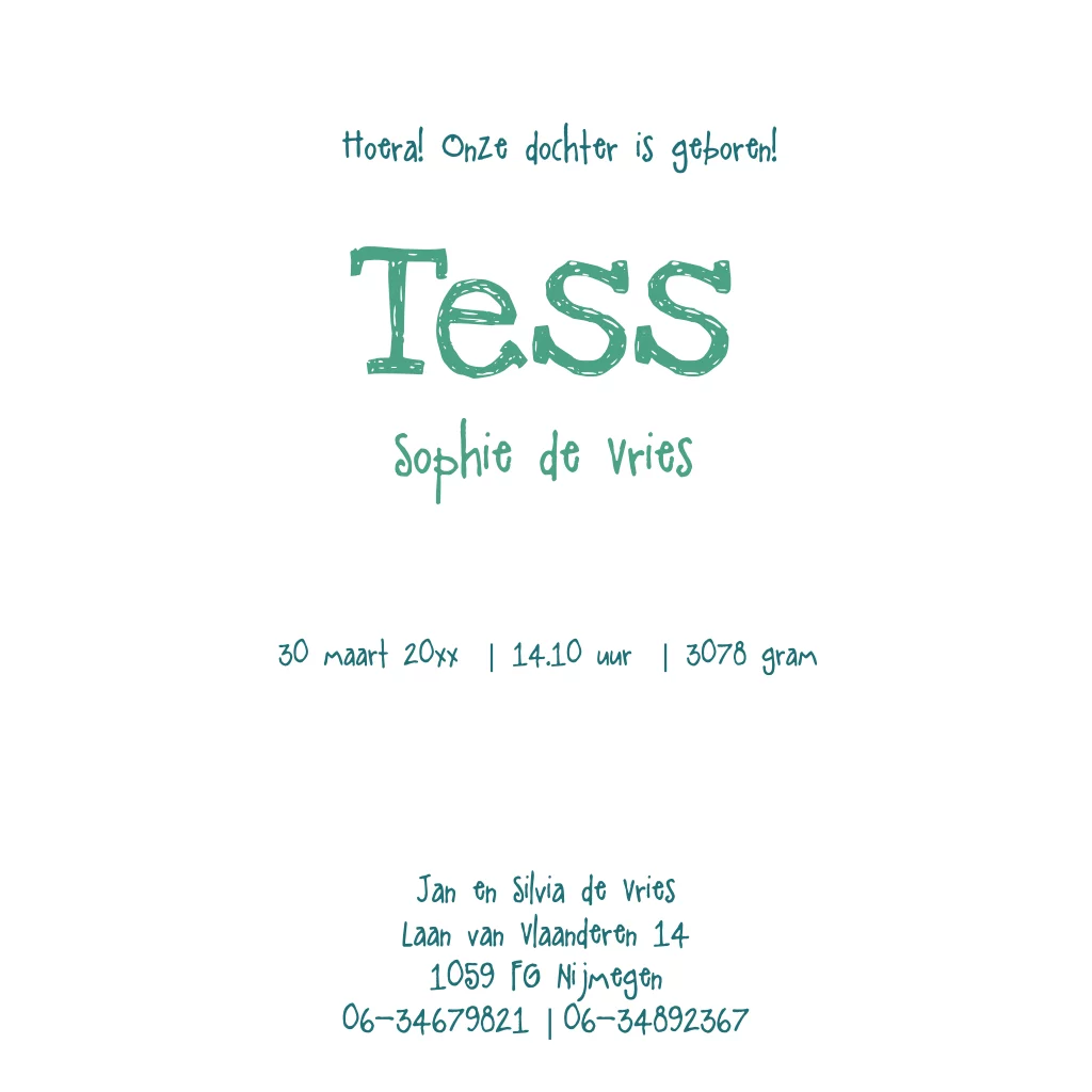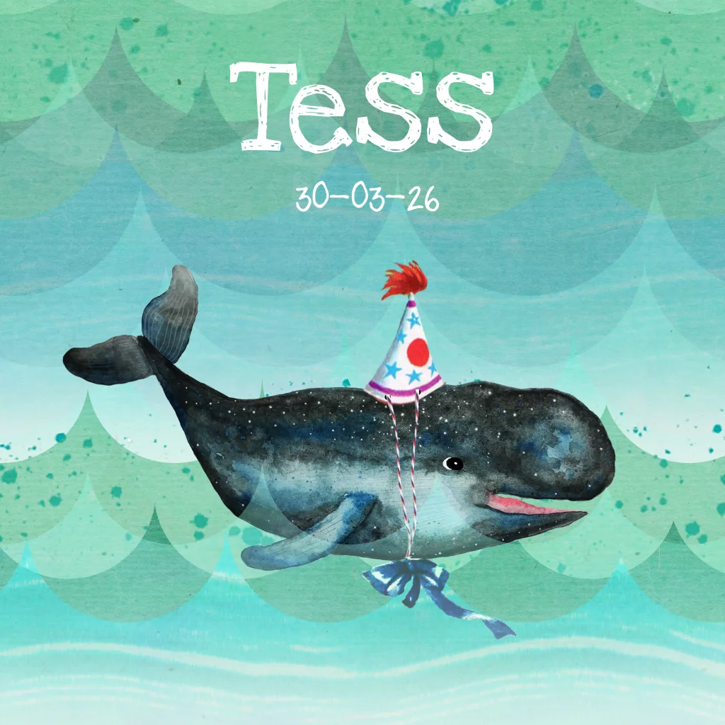 Geboortekaartje met handgeschilderde walvissen. Wat een feest! Er is een nieuw walvisje geboren. Prachtige kleuren zoals zeegroen en aquablauw in mooi grafisch patroon.(8011)