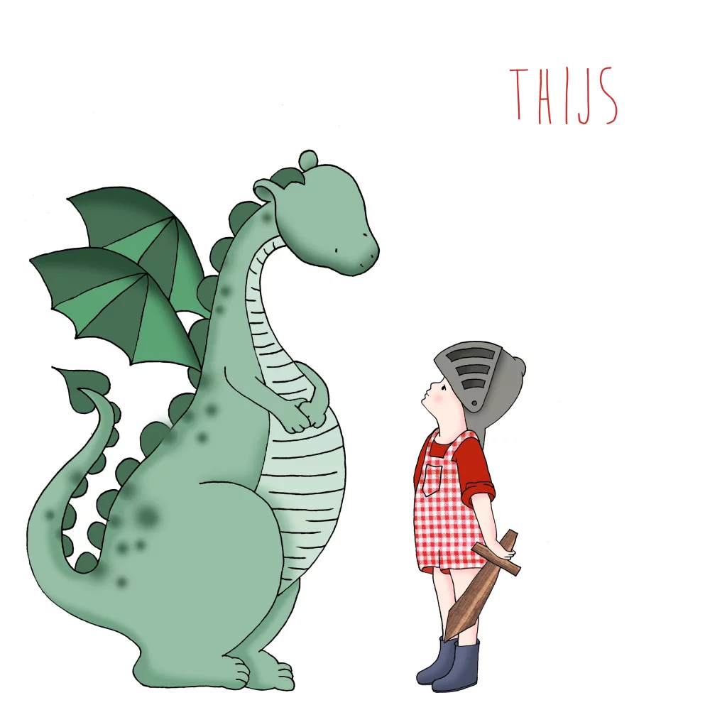 Dit handgetekende geboortekaartje van een draakje of dino en klein riddertje is erg aandoenlijk. Volgens mij willen ze alleen maar vriendjes zijn. (5818)