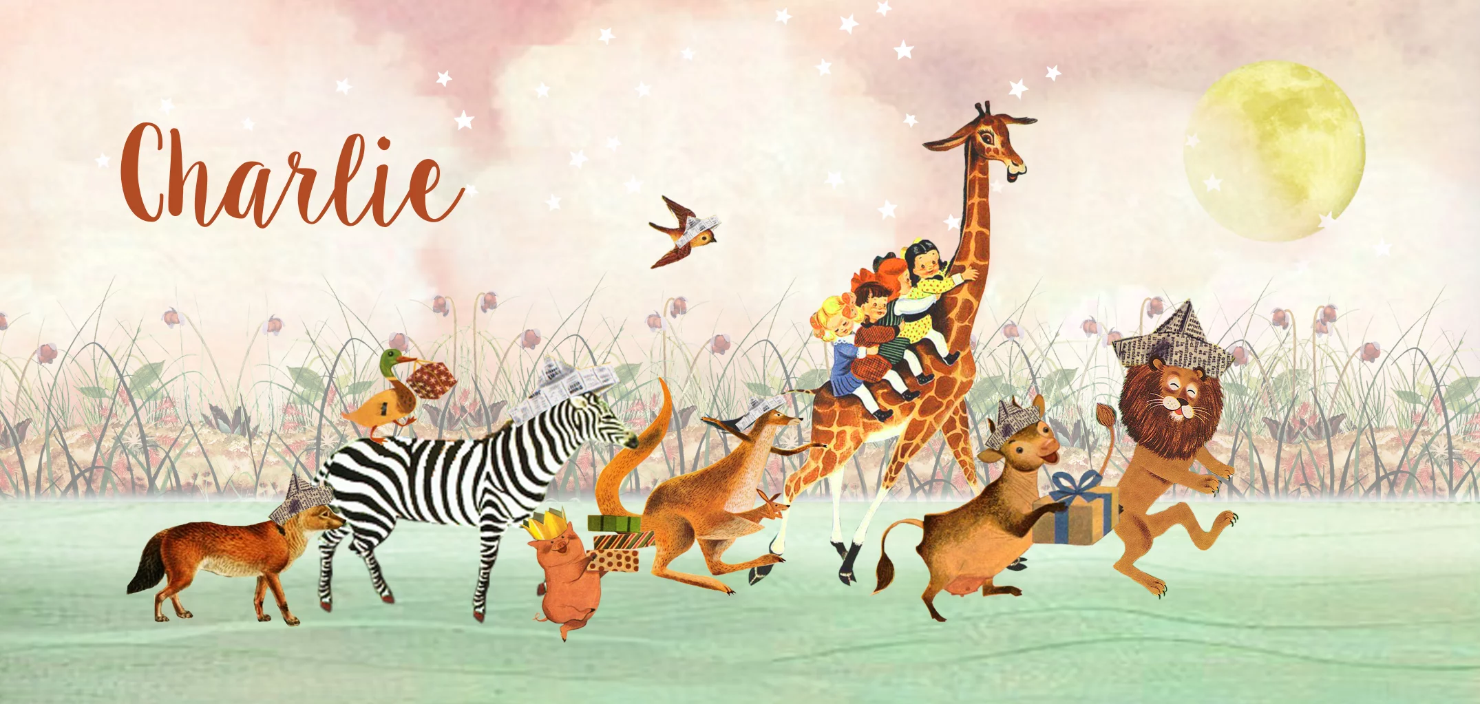Langwerpig geboortekaartje met een dieren parade optocht. Leuke getekende dieren die je ook kunt verplaatsen.. (8585)