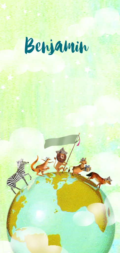 Een langwerpige staande geboortekaart is erg populair momenteel. Zeker deze fleurige kaart met dierenparade over de wereldbol. Ook heel goed als adoptiekaart te gebruiken.