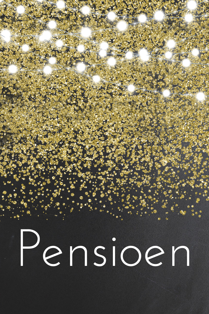 Uitnodiging pensioen met goudkleurige glitters op krijtbord. (7139)
