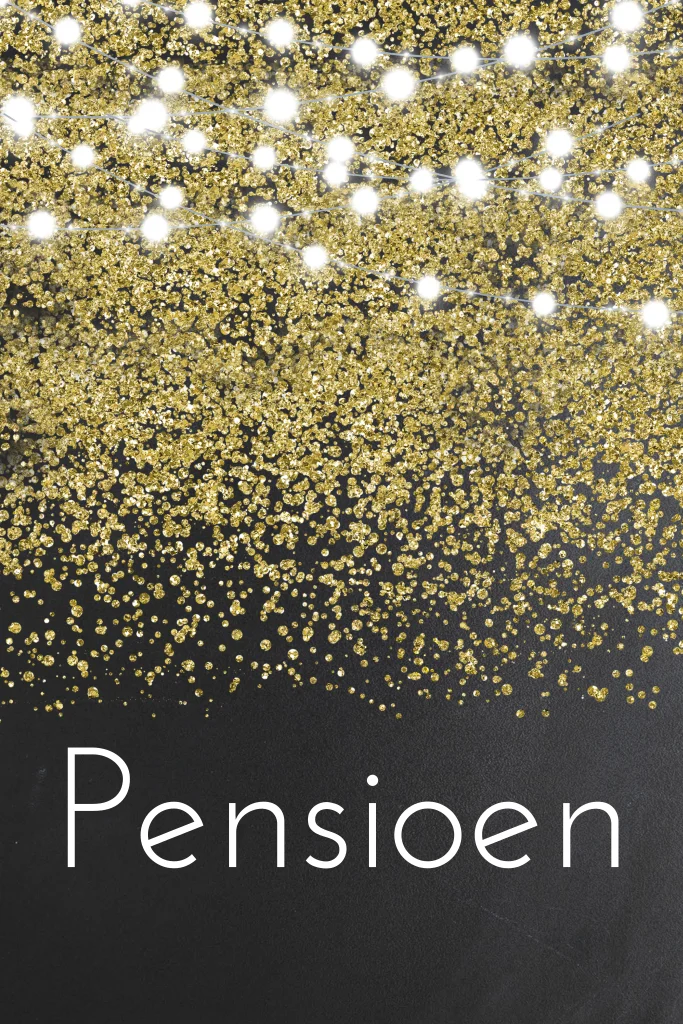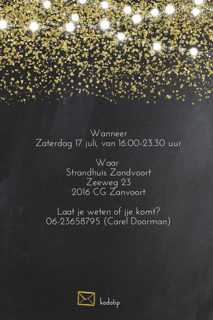 Uitnodiging pensioenfeest met gouden glitters op krijtbord